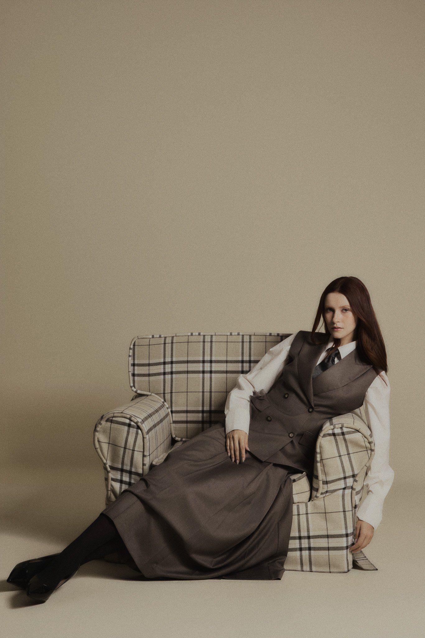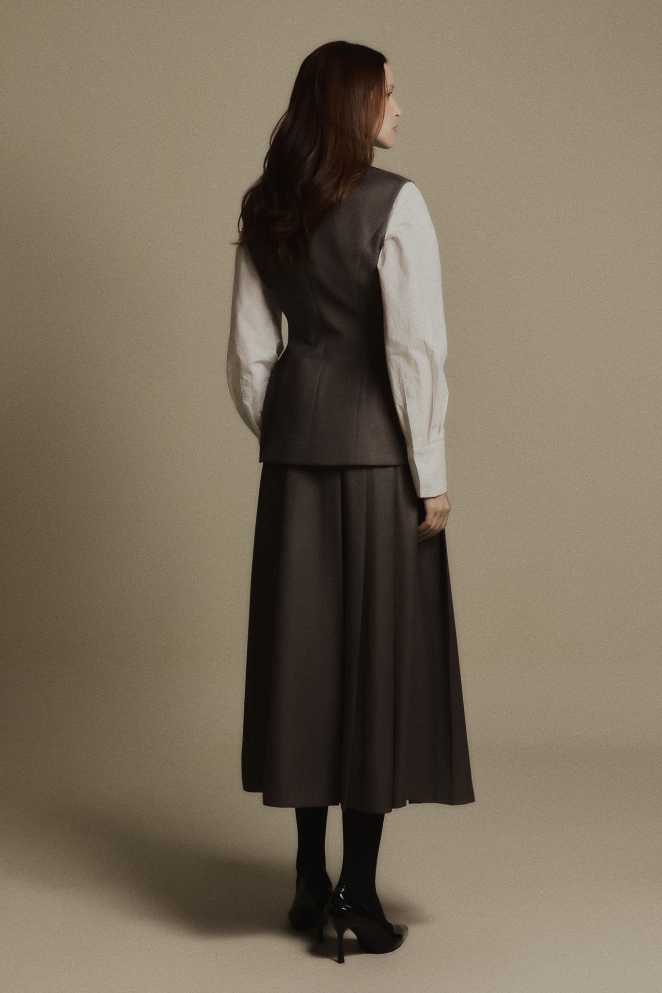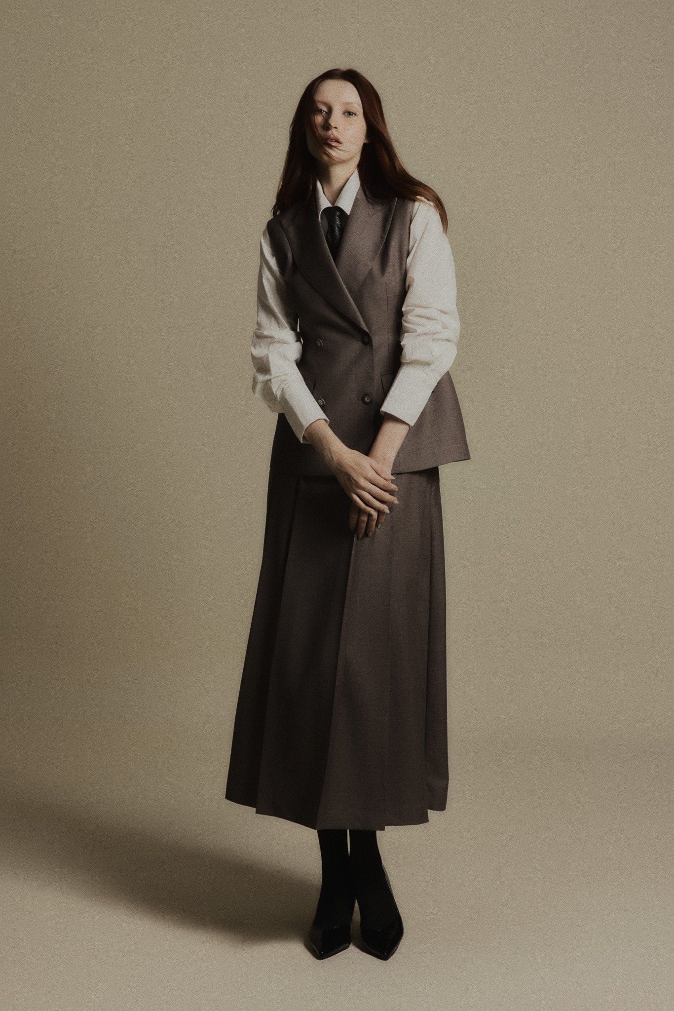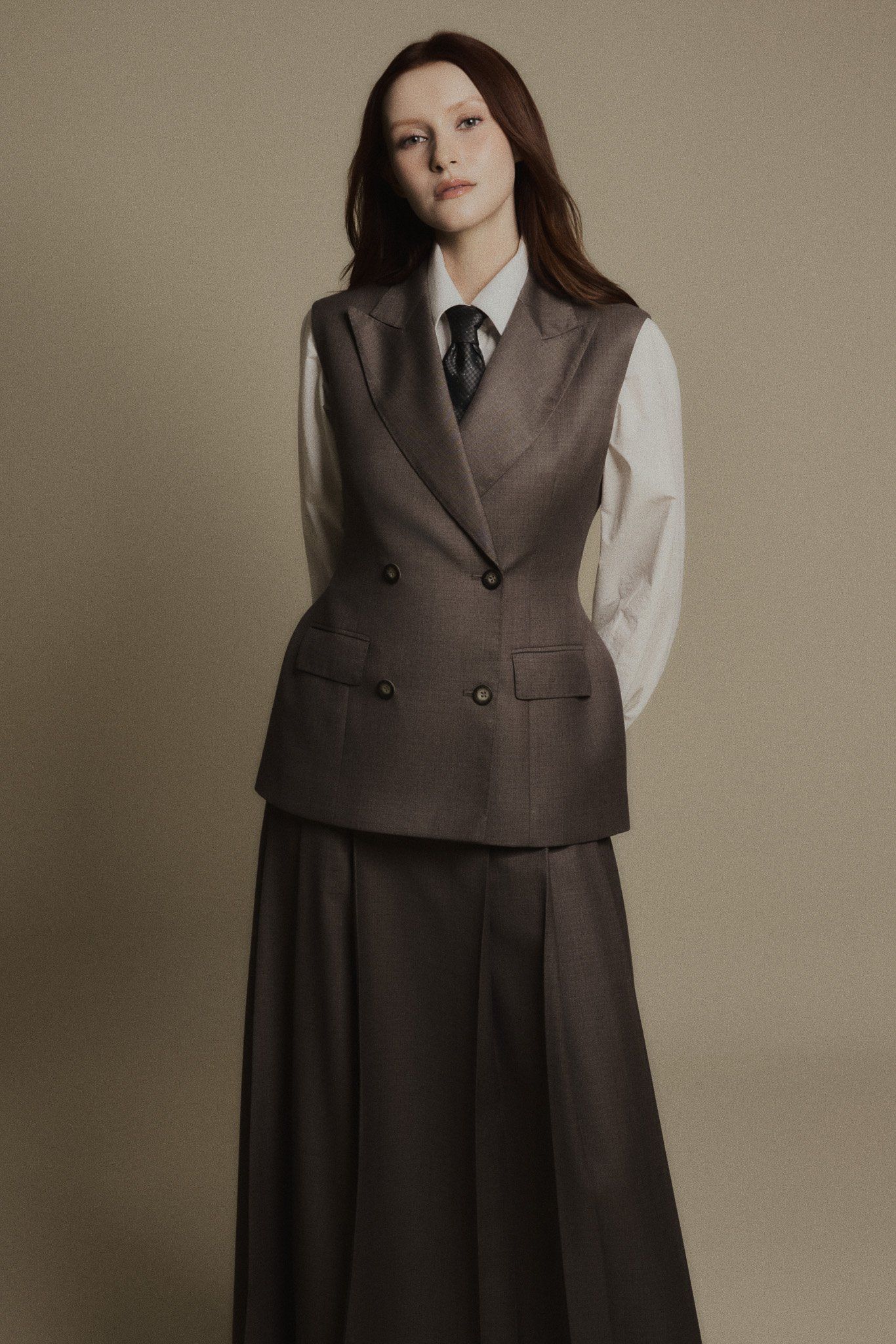 ASH GREY TAILORED VEST là gile dáng dài double-breasted được dựng khối bằng những đường cắt dứt khoát, sản phẩm mang tinh thần kỷ luật và sự tự tin trong từng nhịp chuyển động. Phần gile vai rộng, cổ ve bản lớn và chi tiết khuy đôi giúp tôn dáng, tạo nên dáng đứng quyền lực.