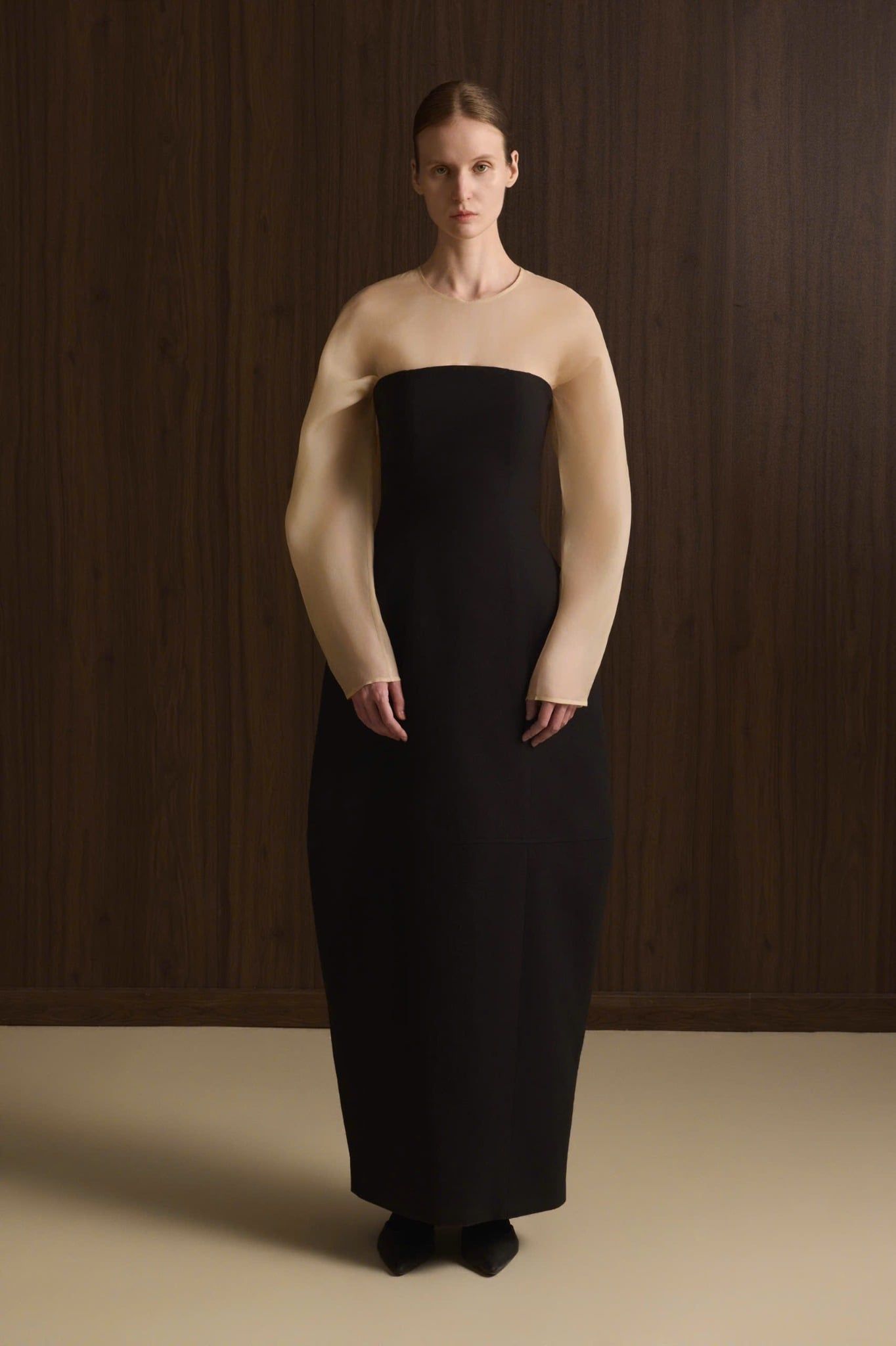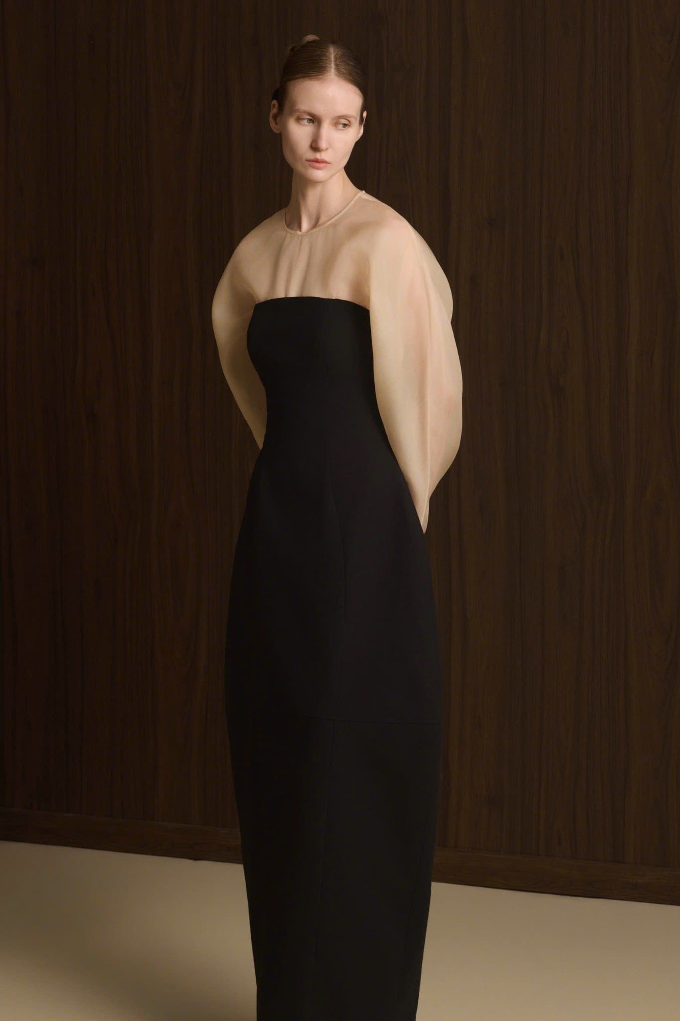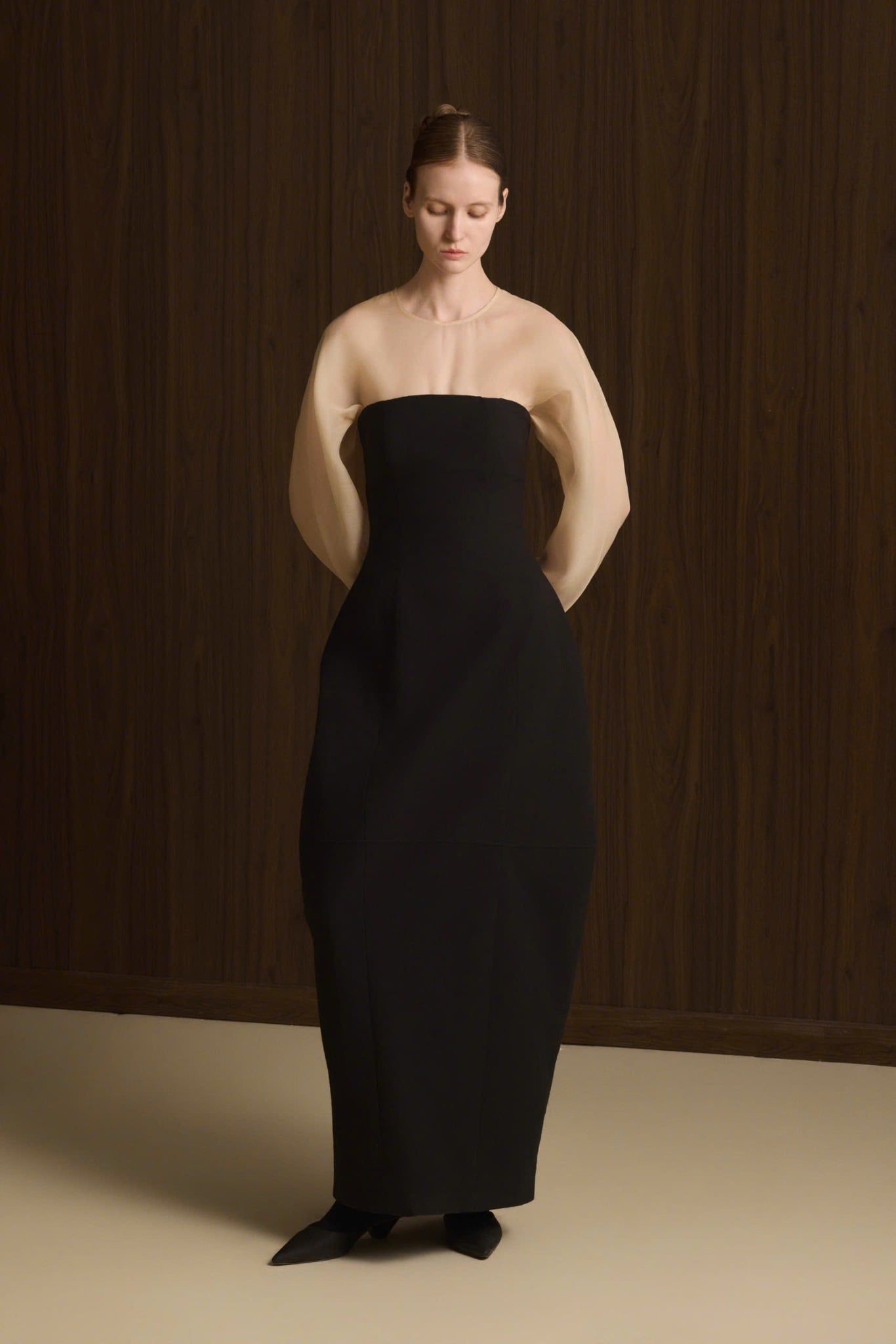 Một thiết kế tồn tại giữa hai trạng thái: che phủ và phơi bày, mềm mại và kiểm soát. Lớp organza mỏng phủ bên ngoài như một làn sương trong suốt, nhẹ, và gần như không trọng lượng.