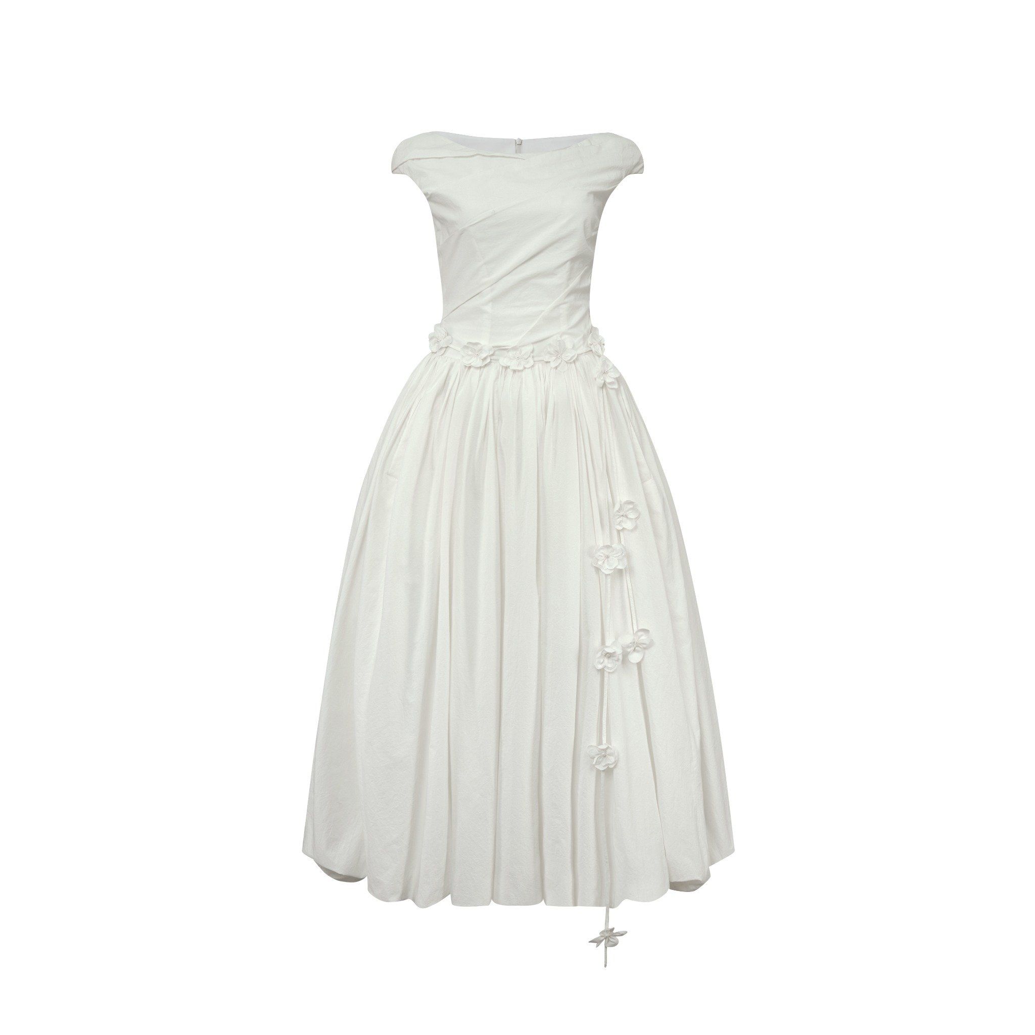 𝗕𝗟𝗢𝗢𝗠𝗜𝗡𝗚 𝗕𝗘𝗟𝗟𝗘 – 𝗗𝗥𝗔𝗣𝗘𝗗 𝗕𝗔𝗟𝗟𝗢𝗢𝗡 𝗗𝗥𝗘𝗦𝗦 là hiện thân của vẻ đẹp thanh khiết và đầy nữ tính. Thiết kế dáng váy phồng nhẹ đặc trưng, với phần chân váy được xử lý tạo phom “balloon” bồng bềnh, nhẹ tênh như cánh hoa đang độ nở rộ. Phần thân trên ôm nhẹ, tay hến tinh gọn giúp tôn dáng vai và tạo cảm giác thanh thoát. Các đường drape được xử lý tinh tế, đi kèm chi tiết dây rút đính hoa tay tạo điểm nhấn mềm mại, mang lại nét duyên dáng nhưng vẫn giữ vững sự tĩnh lặng nội tâm – đúng với tinh thần “The Quiet Soul”.