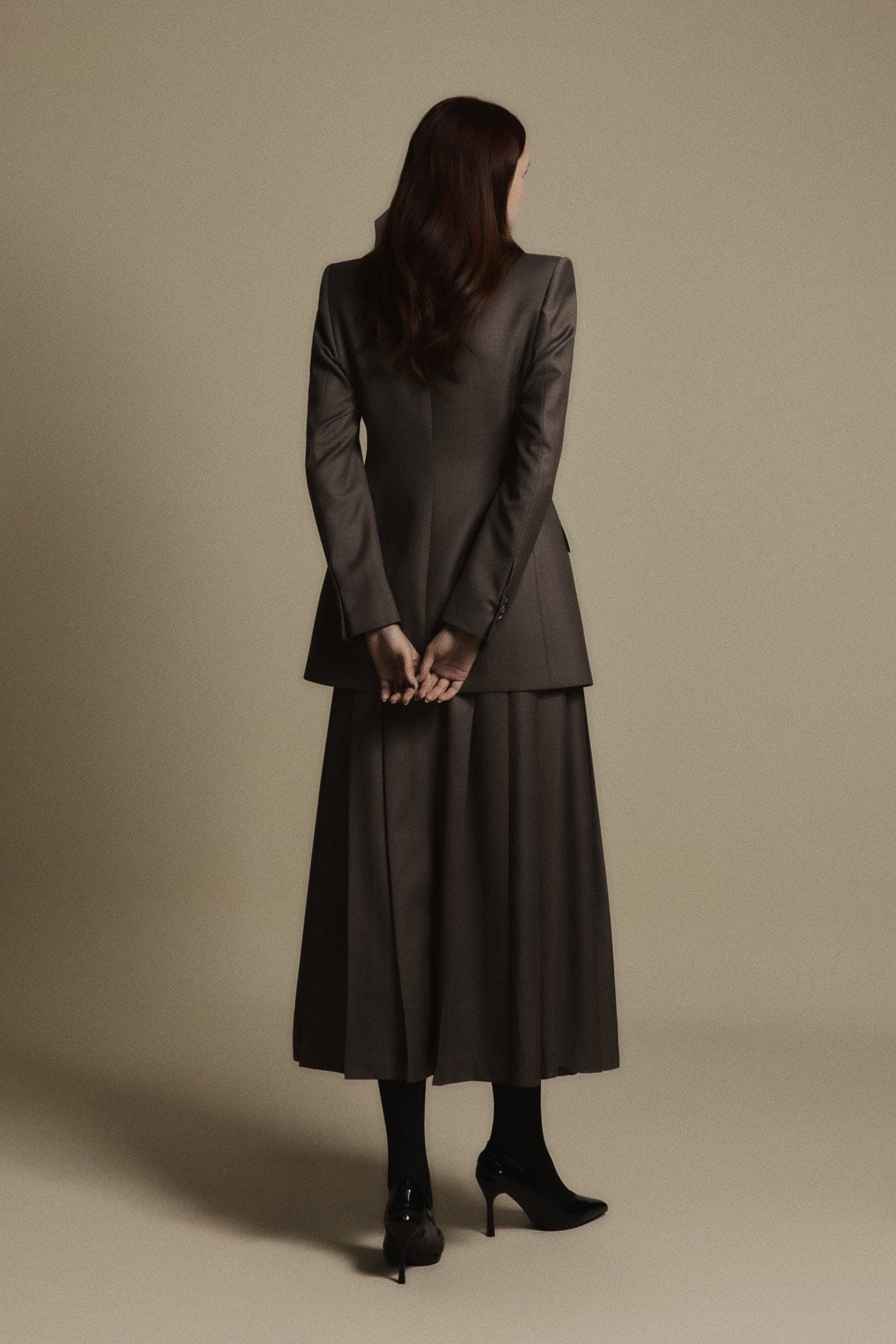 CHARCOAL STONE CLASSIC WOOL BLAZER là chiếc blazer dáng dài với kết cấu vững chãi, phom vai dựng khối sắc nét tạo nên dáng đứng đầy quyền lực. Đường cắt tinh giản nhưng mạnh mẽ, tôn lên sự kỷ luật và dứt khoát của người phụ nữ hiện đại. Thiết kế khuy đôi cùng ve áo nhọn tạo điểm nhấn cổ điển, hài hòa với dải nơ mềm mại nơi cổ, mang đến sự đối lập đầy tinh tế giữa cứng cáp và nữ tính.