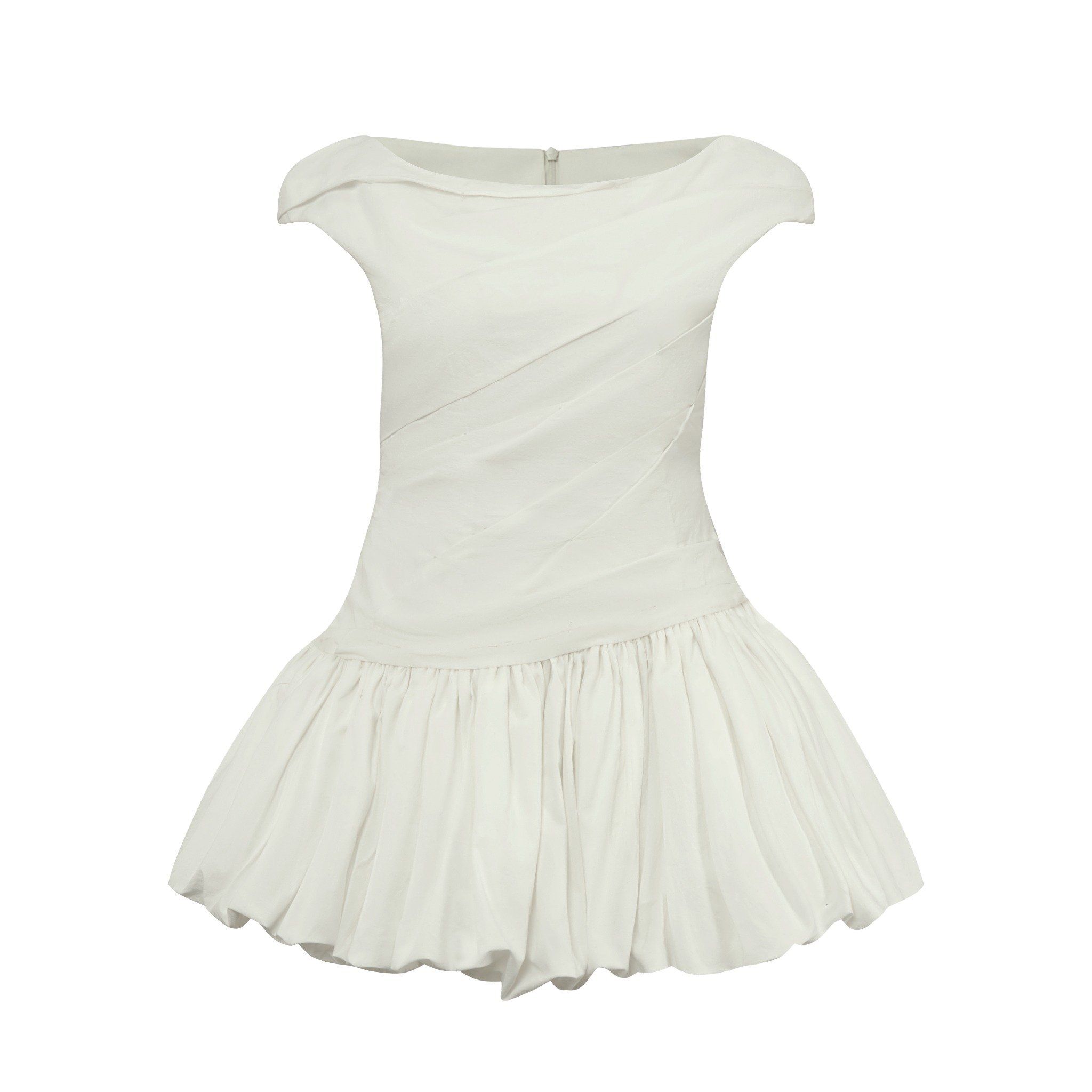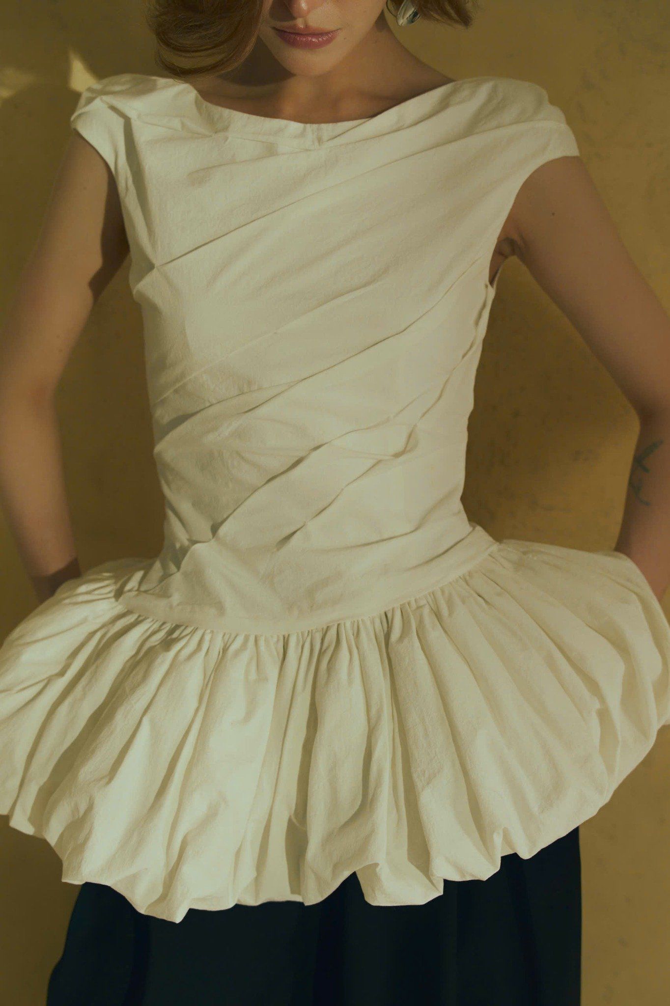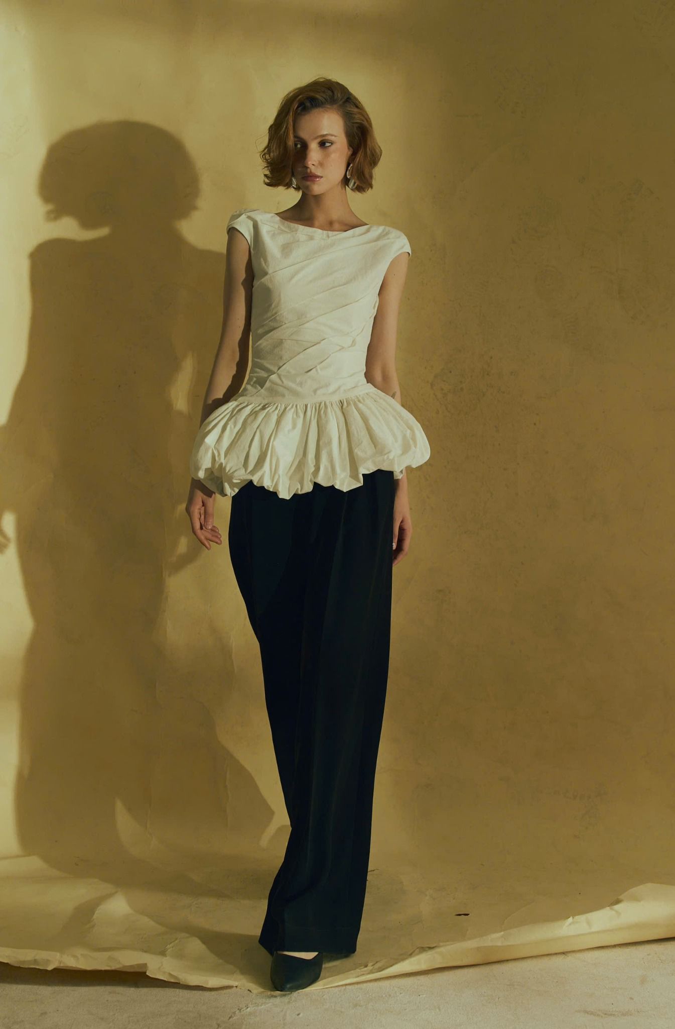 𝗖𝗟𝗢𝗨𝗗 𝗕𝗔𝗟𝗟𝗢𝗢𝗡 – 𝗗𝗥𝗔𝗣𝗘𝗗 𝗧𝗢𝗣 là thiết kế mang cảm hứng từ hình ảnh đám mây trôi lơ đãng trên bầu trời tĩnh lặng. Với phần thân được dựng phom xéo tinh tế, kết hợp kỹ thuật drape bất đối xứng ôm nhẹ lấy cơ thể, thiết kế tạo nên cảm giác chuyển động mềm mại như những làn gió. Phần peplum phồng bồng phía dưới được xử lý tạo khối tự nhiên, mang lại hiệu ứng thị giác ấn tượng nhưng vẫn giữ trọn vẻ dịu dàng, kín đáo. Tay hến gọn nhẹ giúp tôn phần vai, tạo nên tổng thể thanh thoát, thanh lịch, rất “The Quiet Soul”.