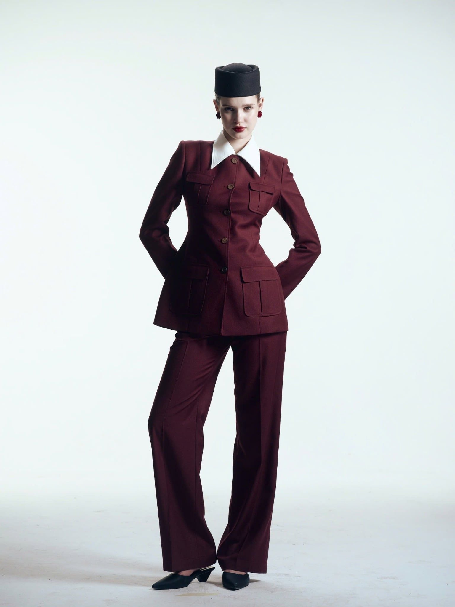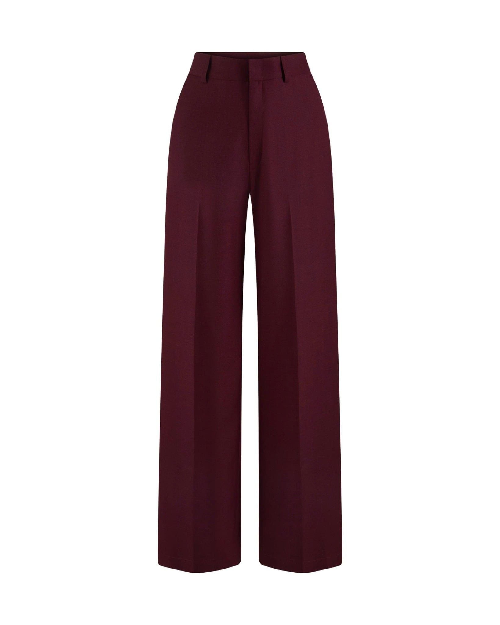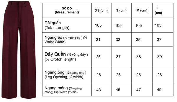 Màu crimson burgundy đồng bộ, dễ phối cùng blazer hoặc áo sơ mi.