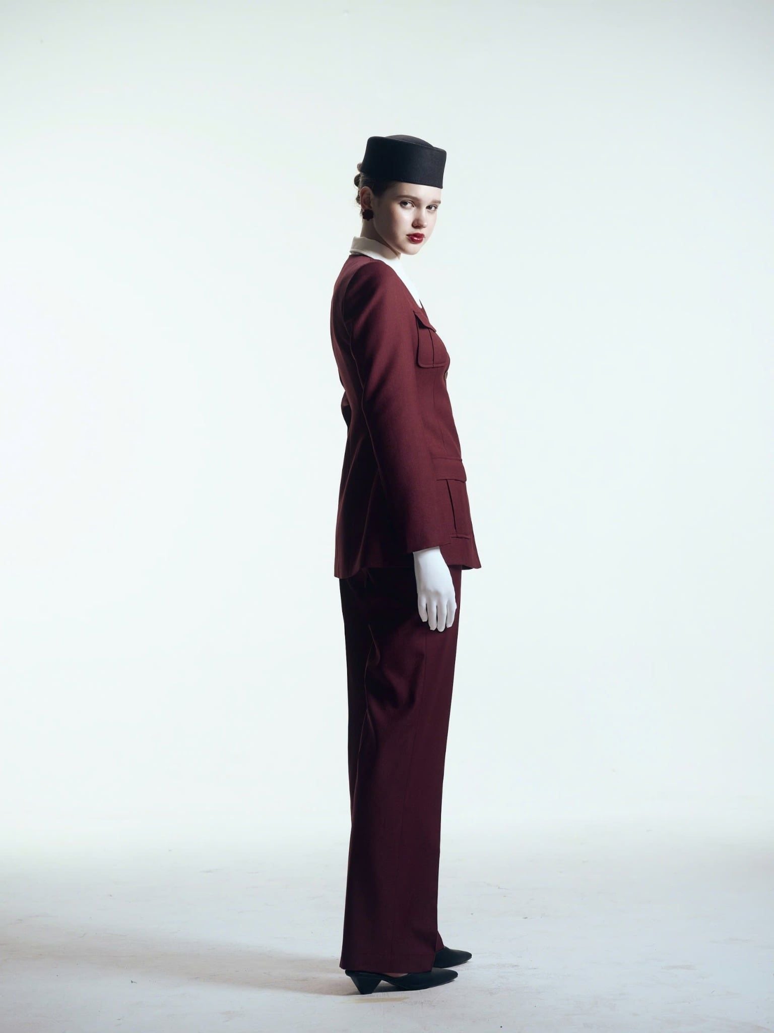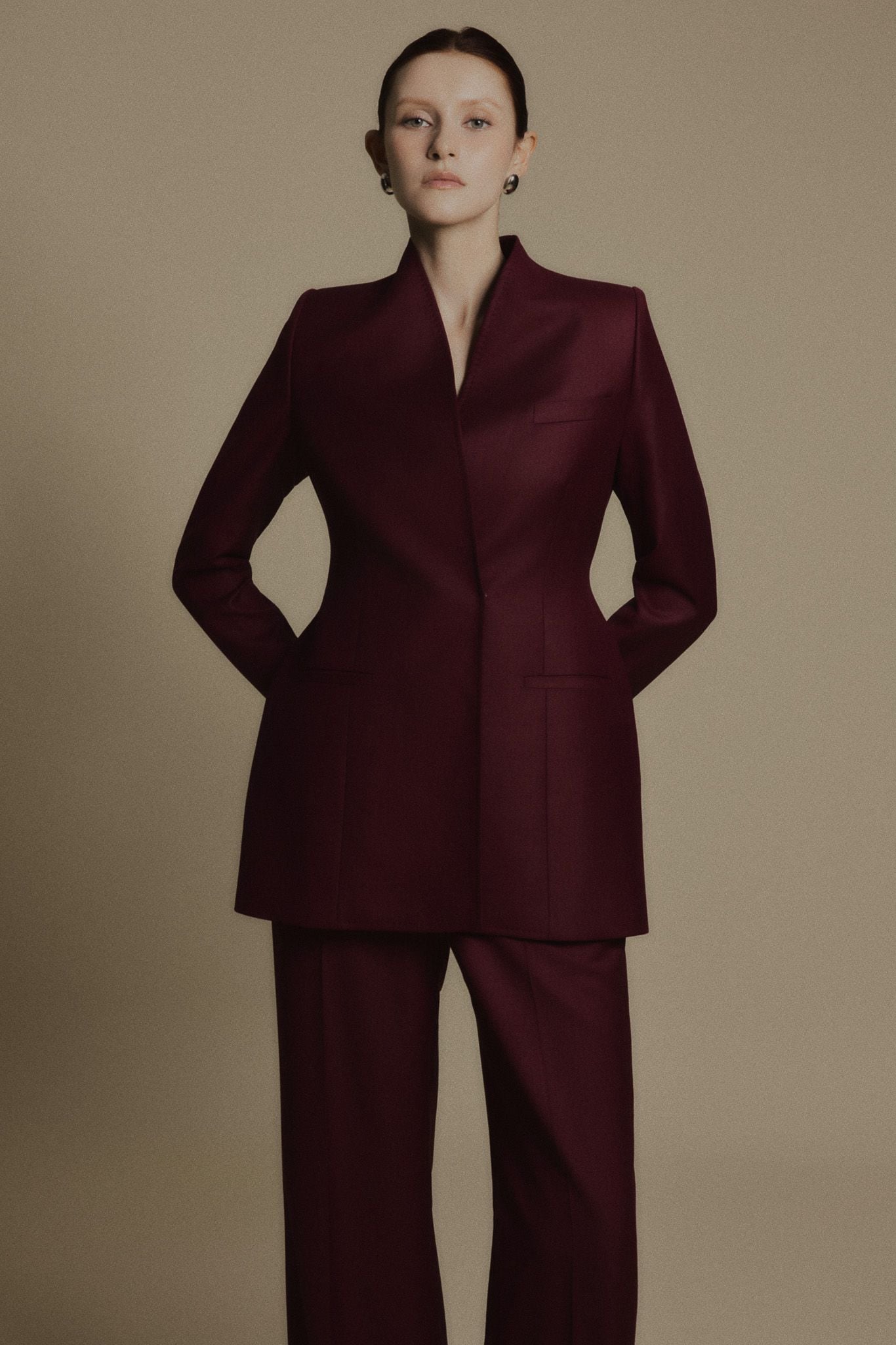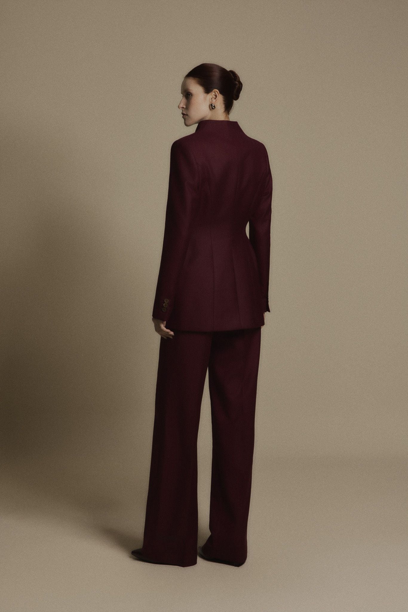 BURGUNDY SILENCE TROUSERS là duần dáng suông ống rộng, tạo sự cân bằng hoàn hảo với blazer dáng dài. Phom quần được dựng khối chắc chắn nhưng vẫn đảm bảo sự thoải mái trong chuyển động. Đường ly sắc nét kéo dài từ hông xuống gấu, giúp đôi chân thêm thon dài, khẳng định tinh thần kỷ luật và phong thái tự tin.