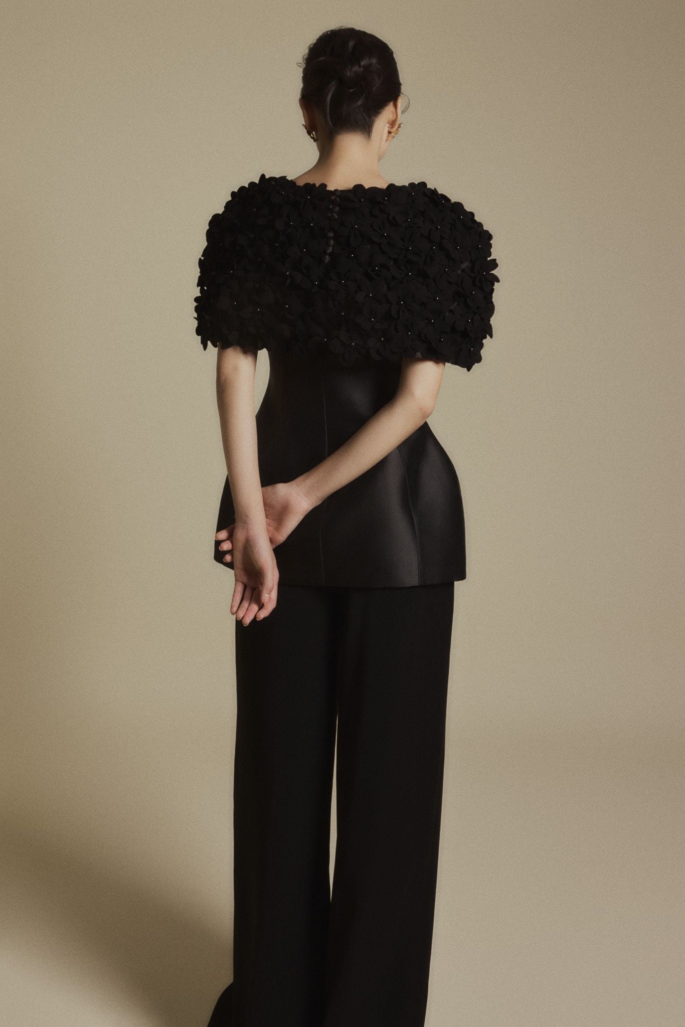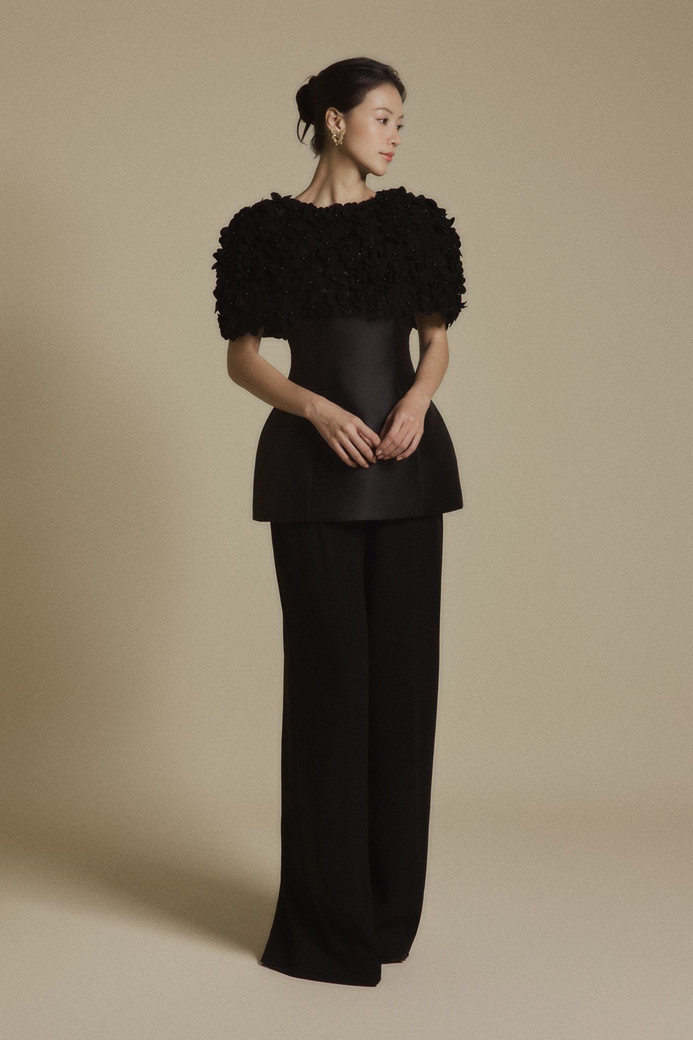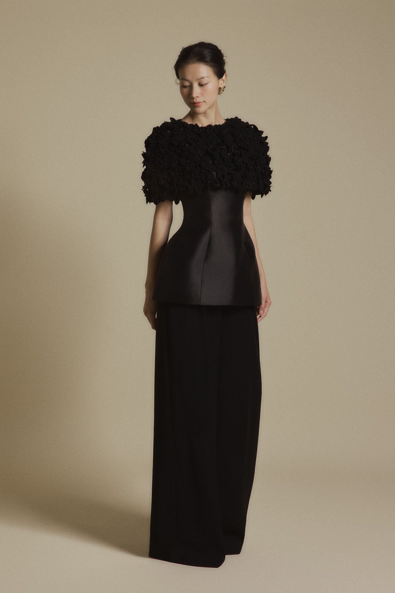 Chất liệu: Taffeta cao cấp — bề mặt có độ ánh nhẹ, đứng form nhưng vẫn giữ được sự mềm mại nữ tính.
