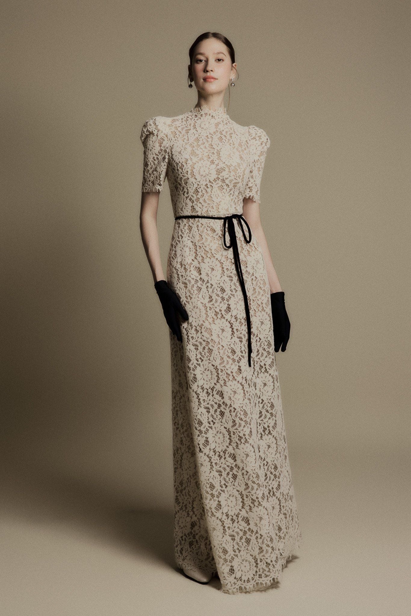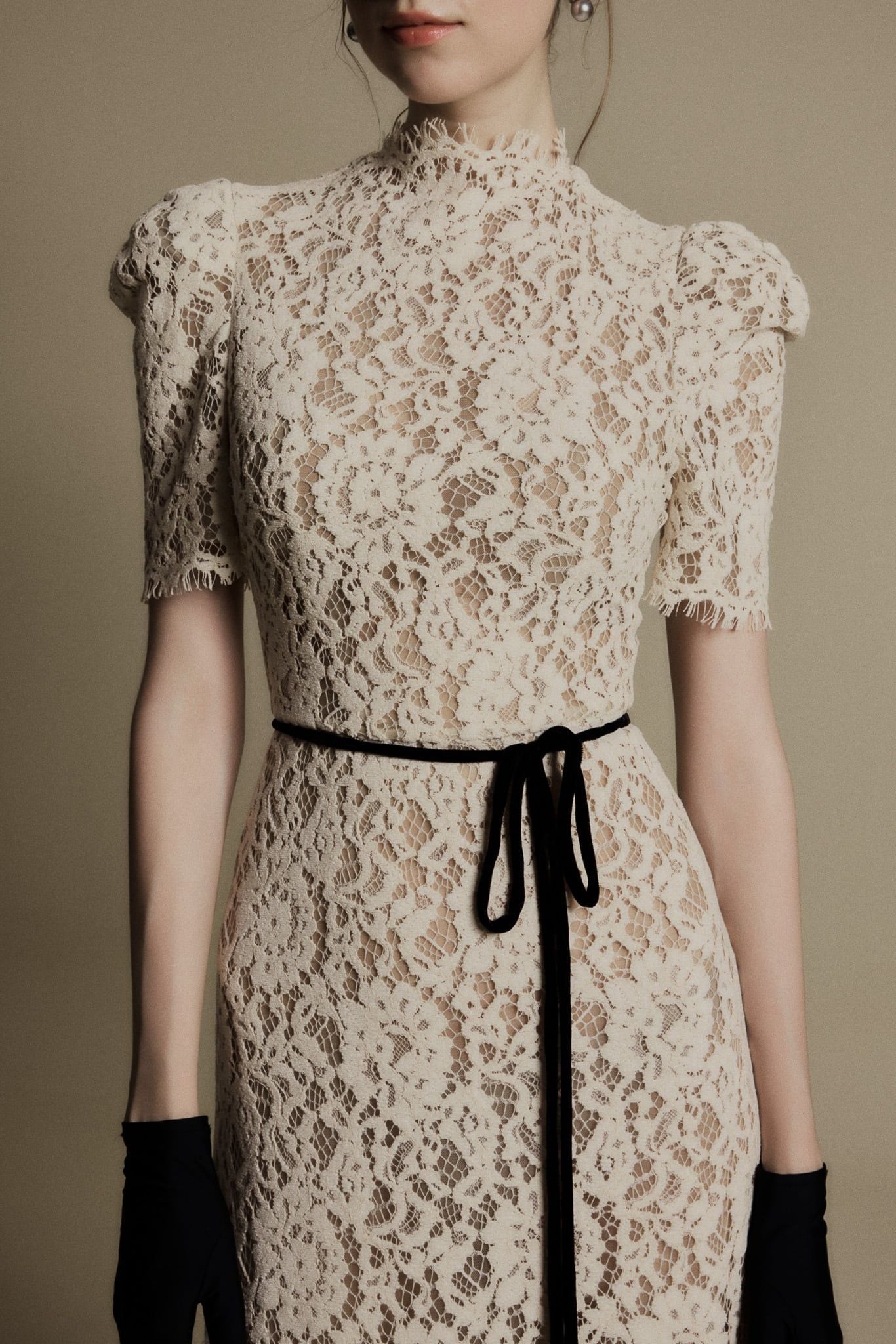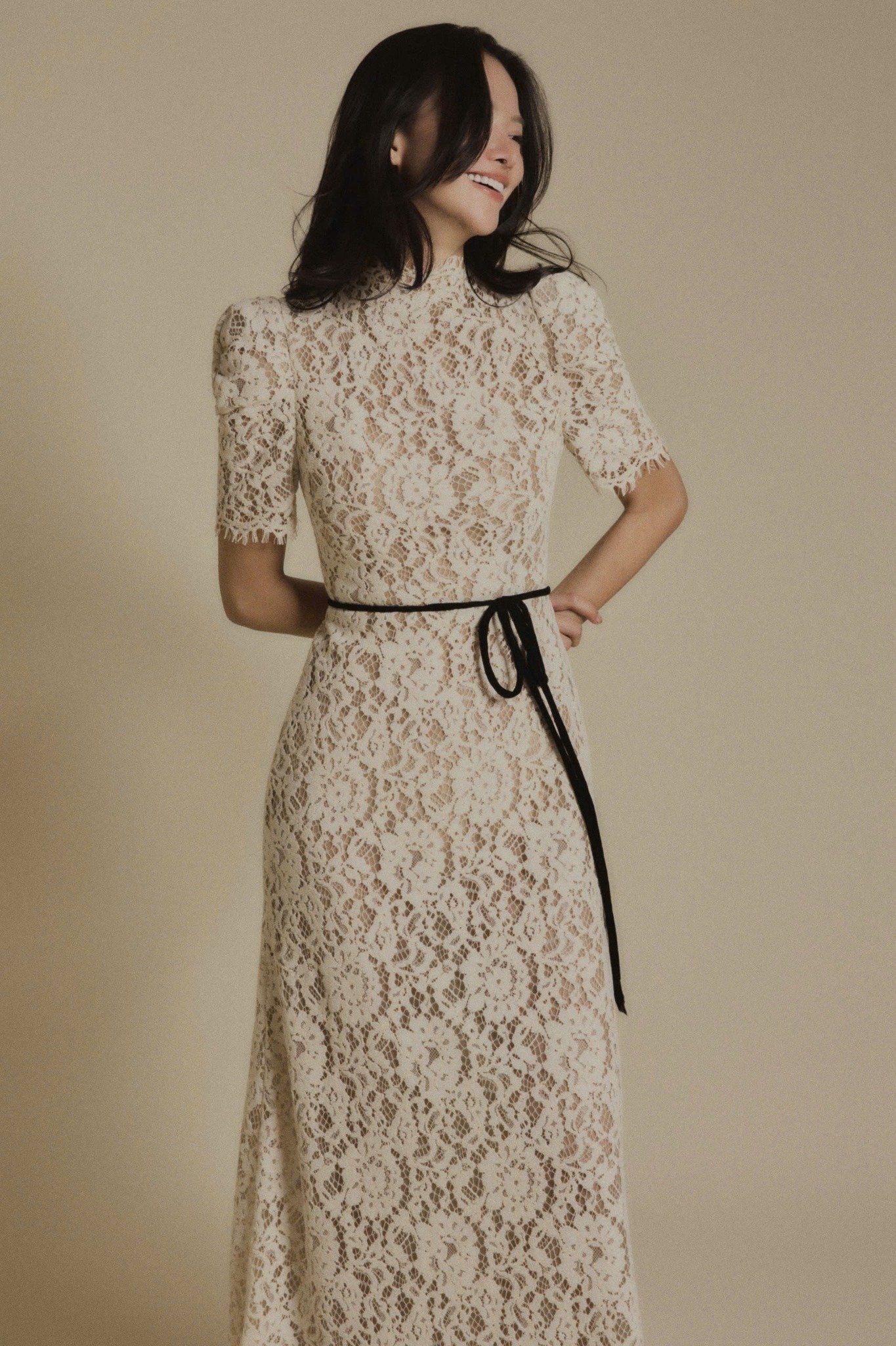 LILY IVORY HIGH NECK LACE DRESS - chiếc đầm ren cổ cao mang sắc ivory thanh khiết, gợi nhớ tinh thần thanh lịch vượt thời gian của những thập niên cổ điển. Thiết kế ôm nhẹ phần eo, tay ngắn phồng nhẹ và cổ cao thanh thoát giúp tôn lên nét yêu kiều, trang nhã của người phụ nữ. Lớp ren phủ toàn thân tạo nên hiệu ứng thị giác tinh tế, mềm mại mà vẫn giữ được cấu trúc trang trọng. Chi tiết dây ruy băng mảnh thắt eo màu đen tương phản mang lại điểm nhấn nhẹ nhàng nhưng sắc sảo, tôn dáng và tạo tỷ lệ hài hòa cho tổng thể. Đây là thiết kế phù hợp cho những dịp đặc biệt, các buổi tiệc thanh lịch hoặc khoảnh khắc cần một vẻ đẹp cổ điển nhưng đầy khí chất.