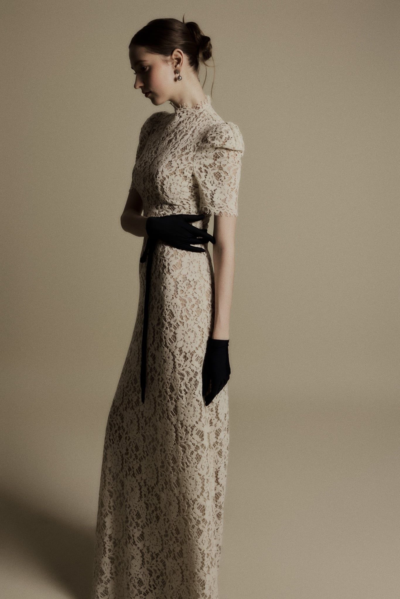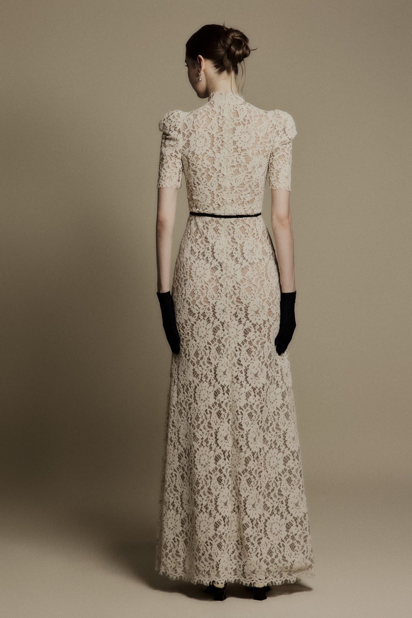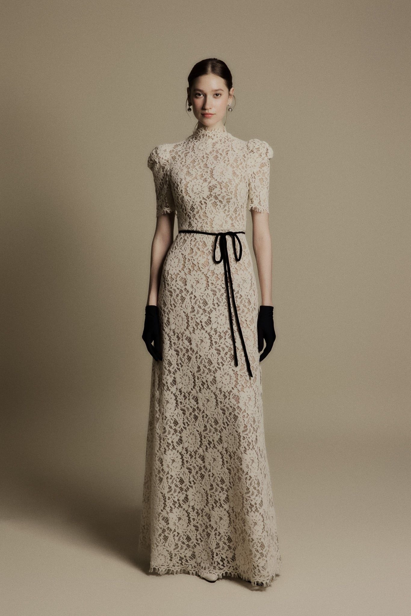 LILY IVORY HIGH NECK LACE DRESS - chiếc đầm ren cổ cao mang sắc ivory thanh khiết, gợi nhớ tinh thần thanh lịch vượt thời gian của những thập niên cổ điển. Thiết kế ôm nhẹ phần eo, tay ngắn phồng nhẹ và cổ cao thanh thoát giúp tôn lên nét yêu kiều, trang nhã của người phụ nữ. Lớp ren phủ toàn thân tạo nên hiệu ứng thị giác tinh tế, mềm mại mà vẫn giữ được cấu trúc trang trọng. Chi tiết dây ruy băng mảnh thắt eo màu đen tương phản mang lại điểm nhấn nhẹ nhàng nhưng sắc sảo, tôn dáng và tạo tỷ lệ hài hòa cho tổng thể. Đây là thiết kế phù hợp cho những dịp đặc biệt, các buổi tiệc thanh lịch hoặc khoảnh khắc cần một vẻ đẹp cổ điển nhưng đầy khí chất.