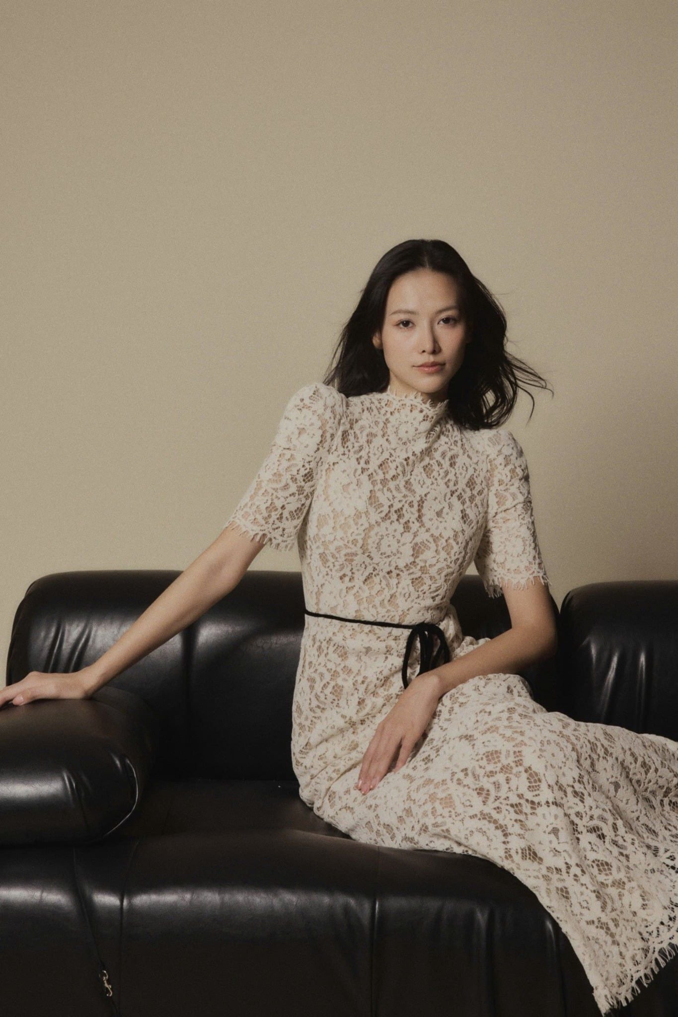 Dây ruy băng mảnh thắt eo tạo điểm nhấn tinh tế.