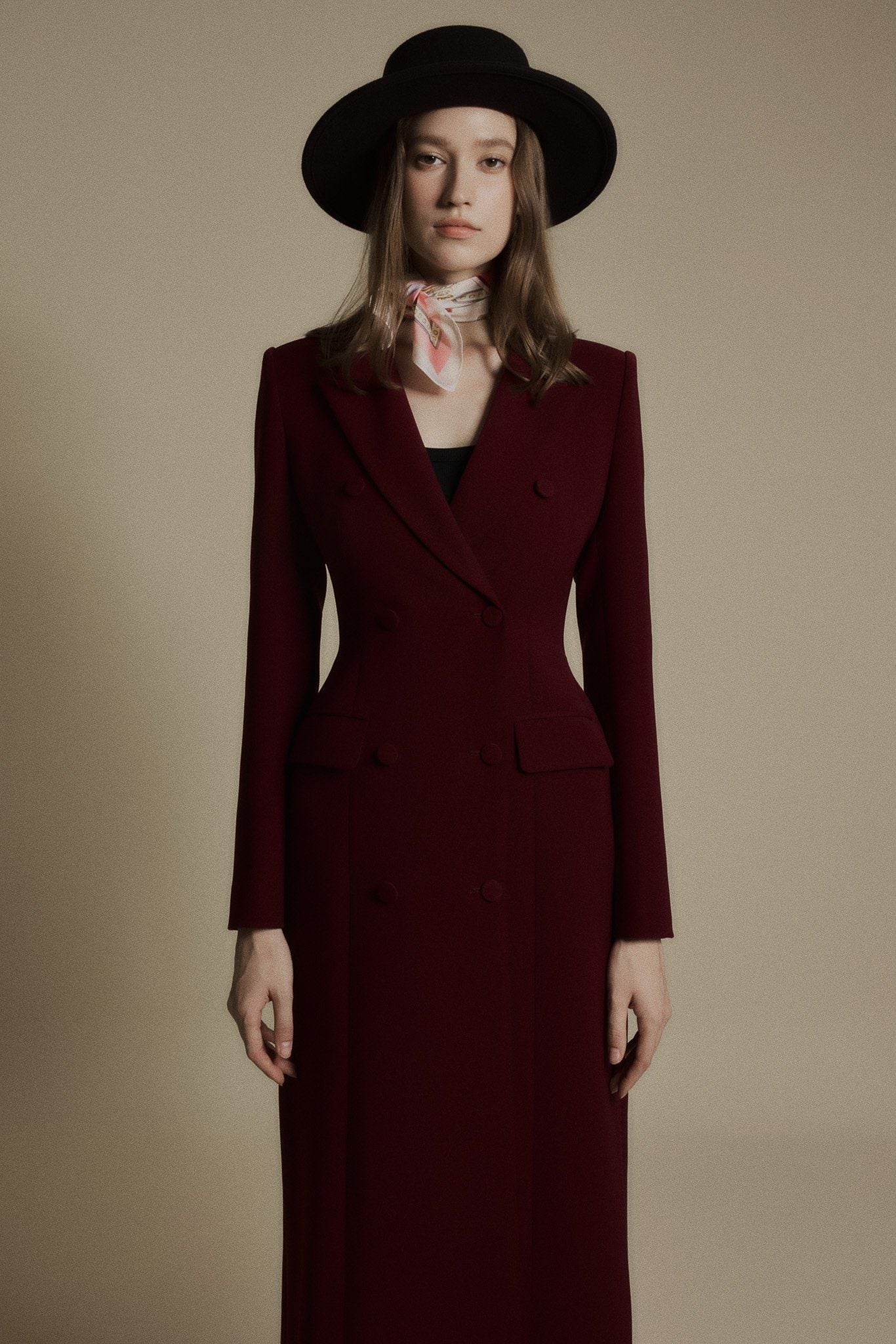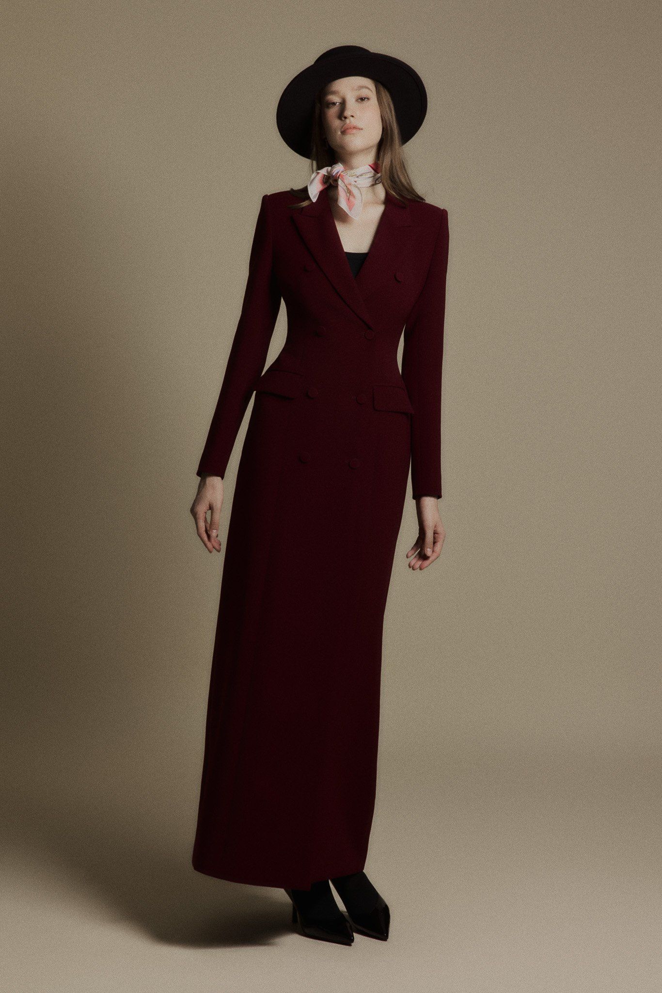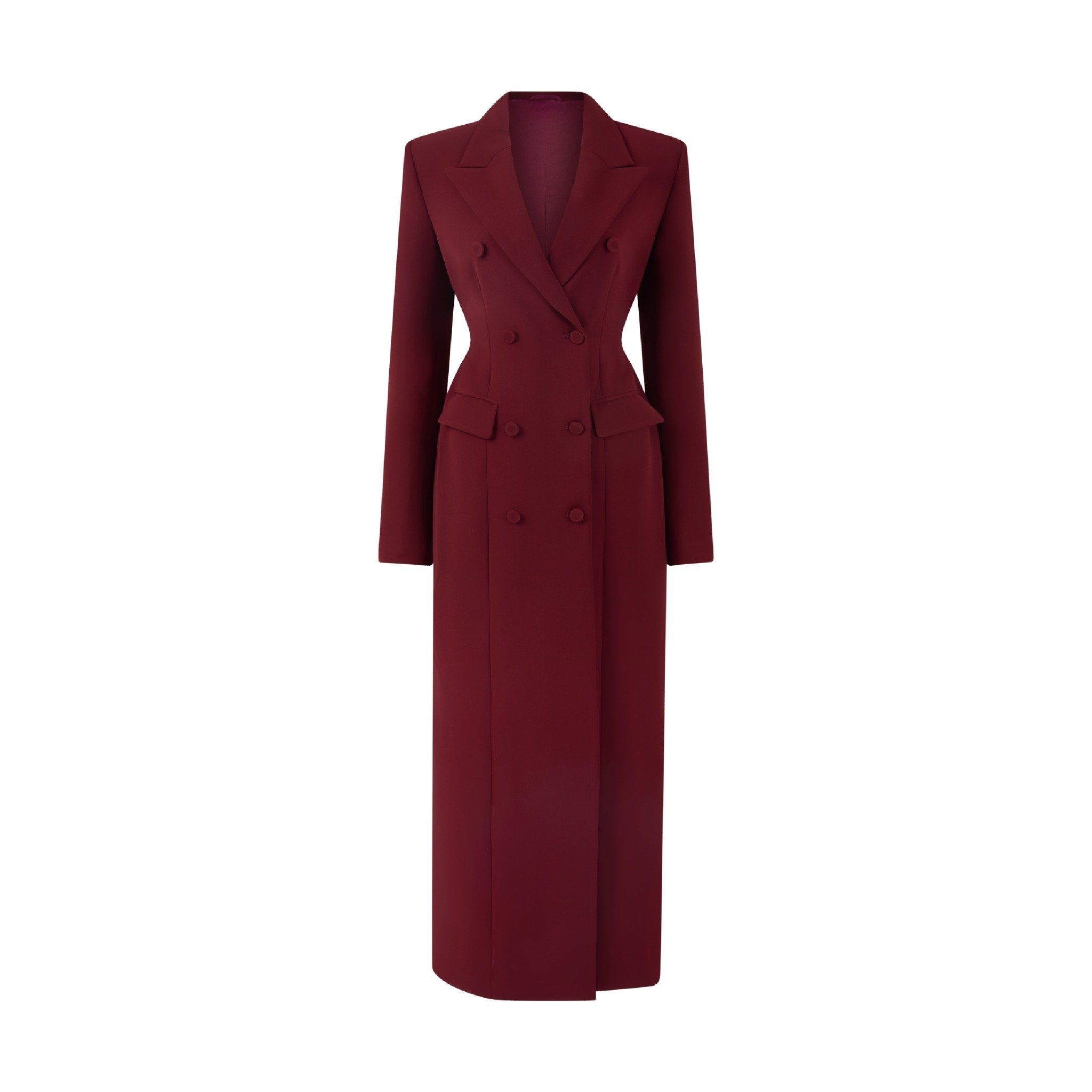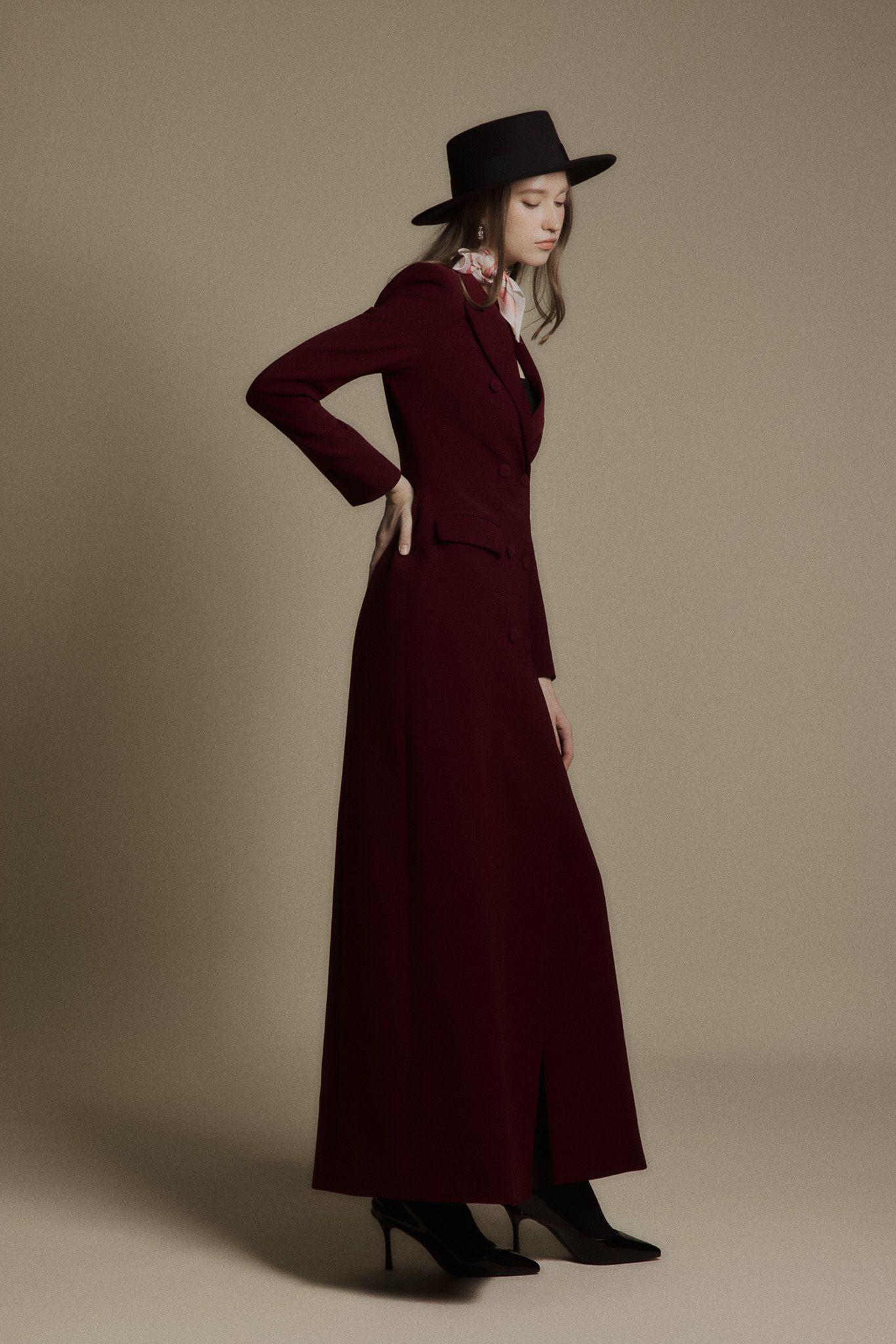 MARI LONG STRUCTURED SUIT là thiết kế suit dài tối giản nhưng đầy cấu trúc, phom dáng dựng khối ôm eo, ve nhọn cổ điển cùng hàng khuy đôi tạo nên đường nét quyền lực. Chiếc suit liền dài chấm gót mang đến vẻ ngoài trang trọng, uy nghiêm nhưng vẫn giữ sự thanh lịch mềm mại. Màu đỏ burgundy sâu lắng gợi cảm giác sang trọng vượt thời gian, tôn bật khí chất tự tin và bản lĩnh của người phụ nữ hiện đại.
