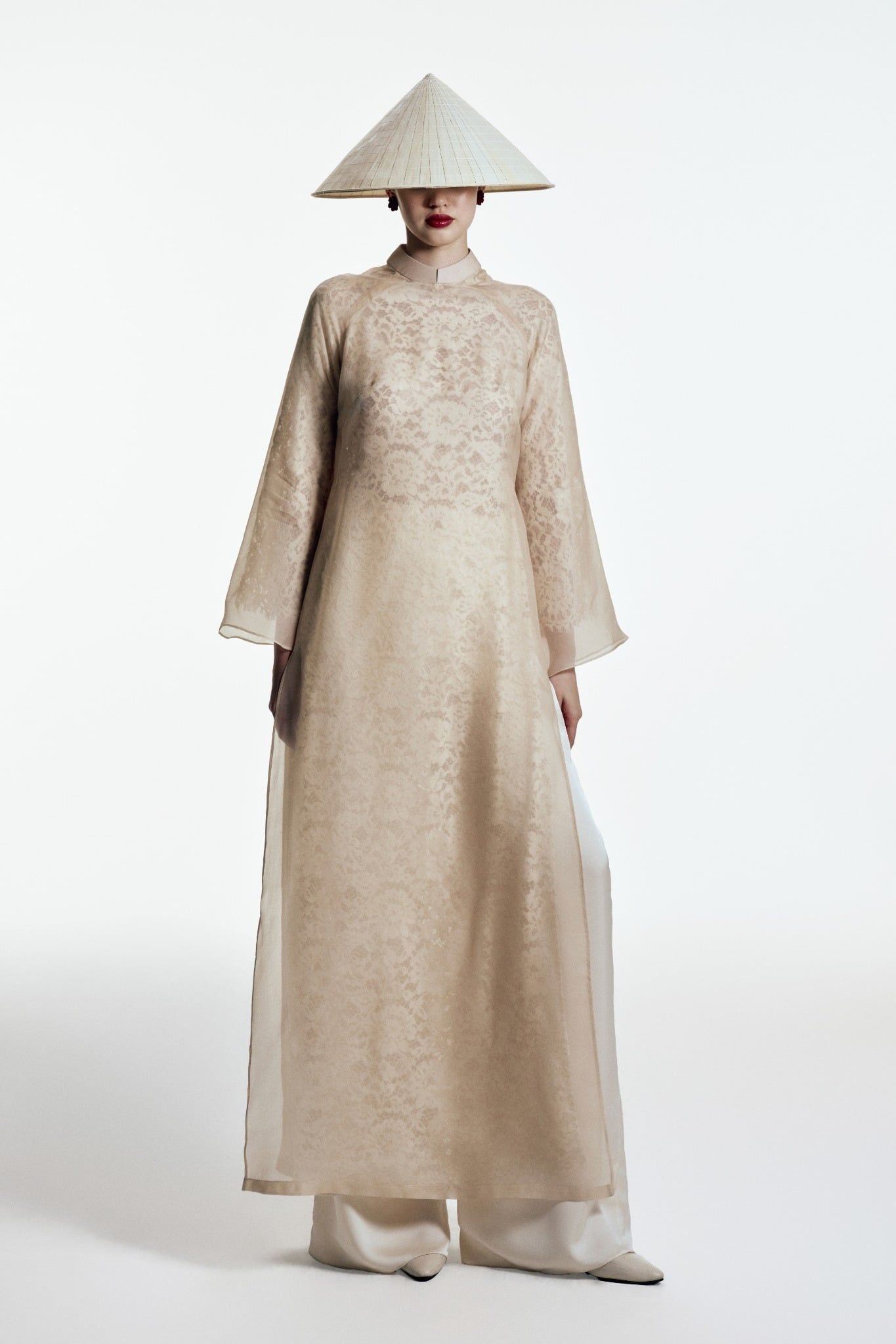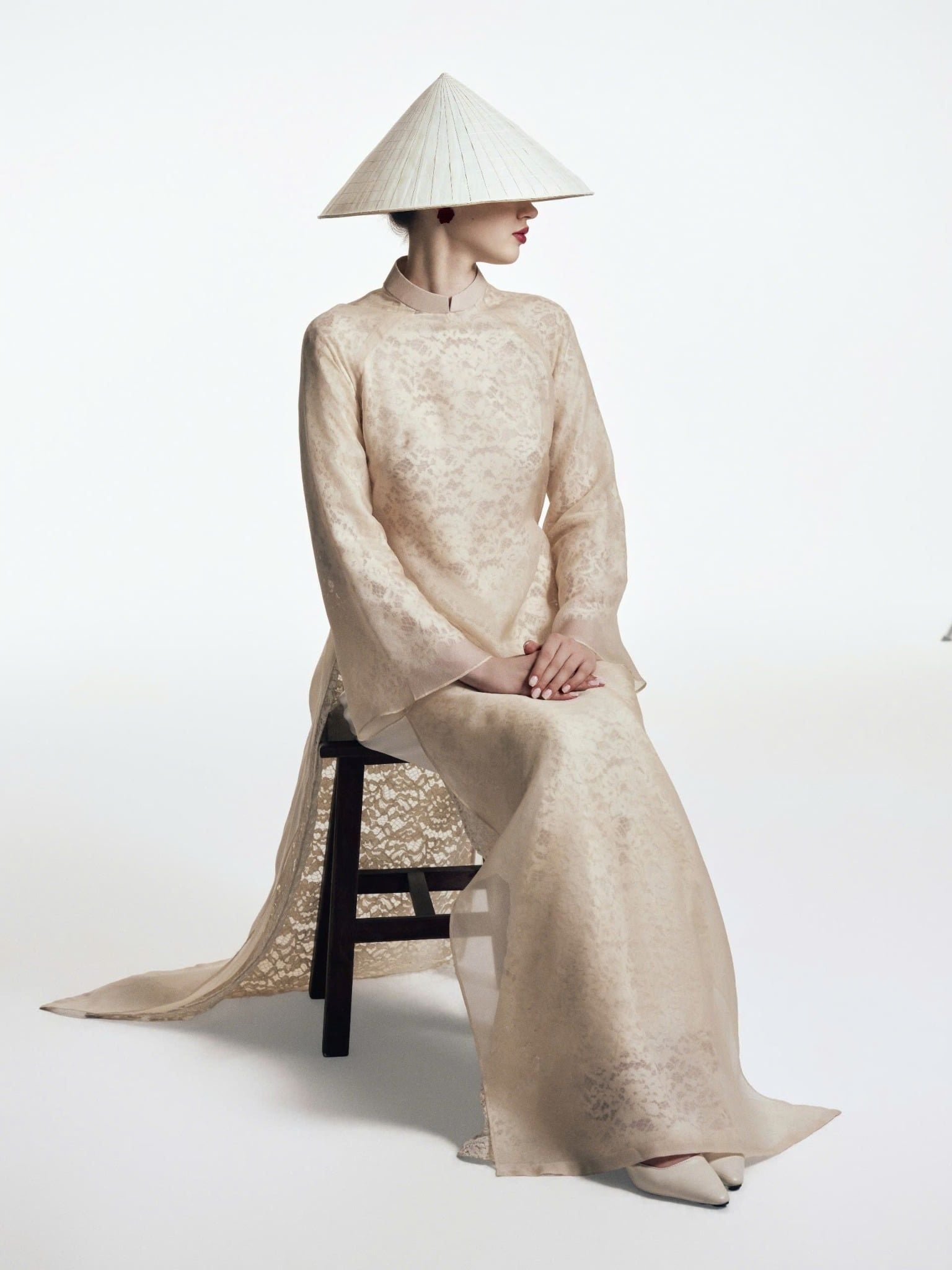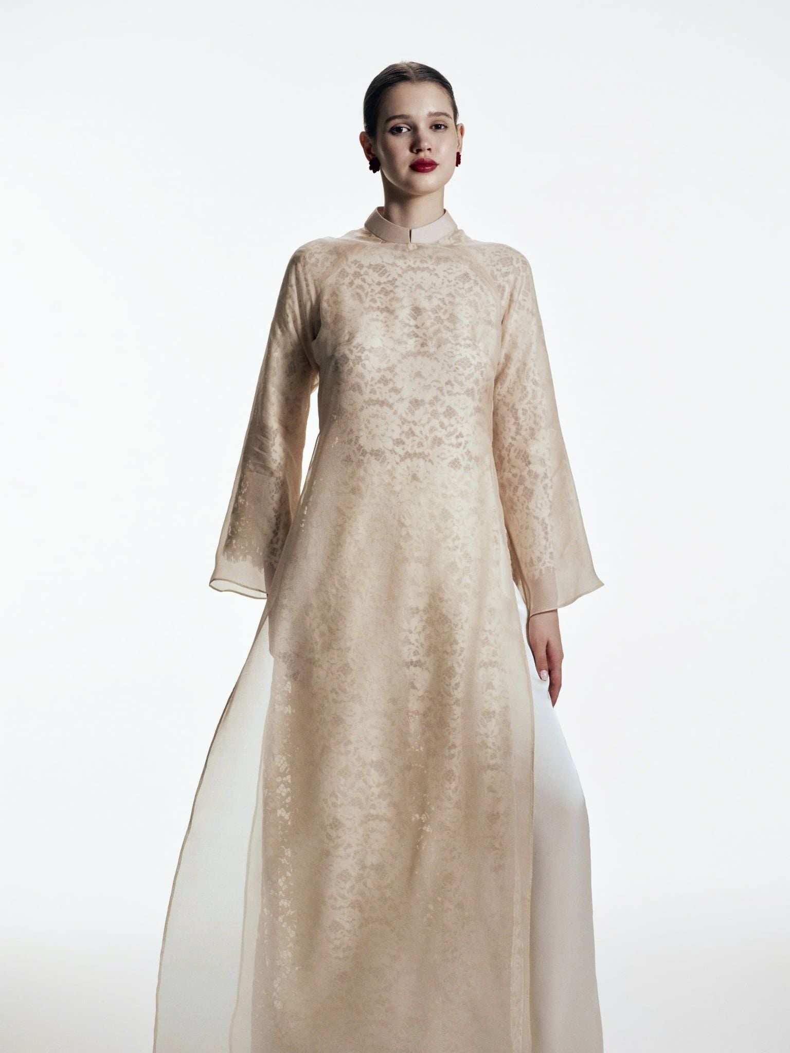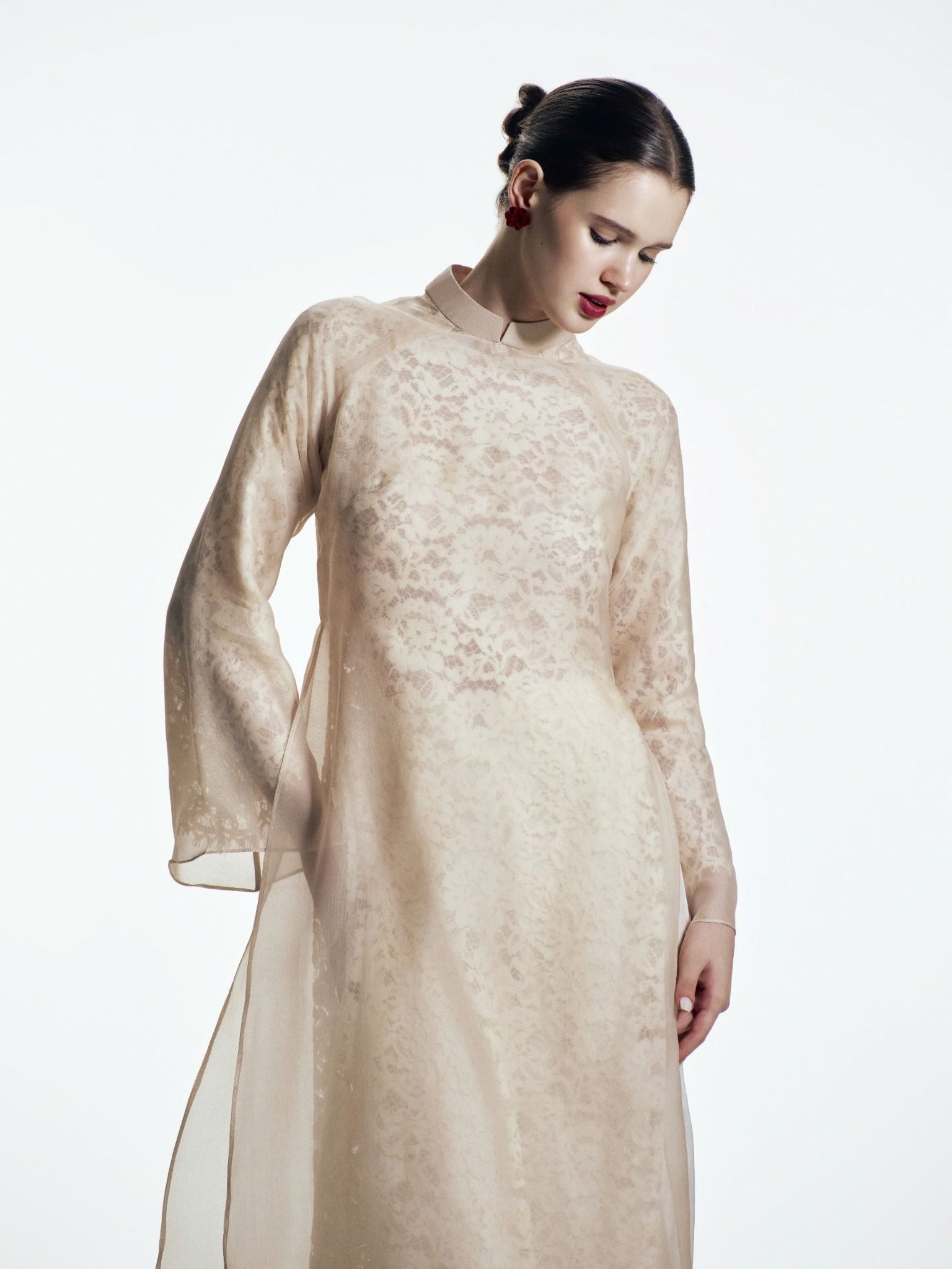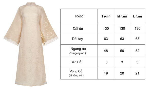 Nguyệt Tĩnh là thiết kế áo dài 2 lớp tinh tế, hòa quyện giữa nét thơ mộng của ren và sự mềm mại cao cấp của tơ tằm. Lớp áo dài trong bằng chất liệu ren cao cấp, cùng với họa tiết tinh xảo tạo hiệu ứng thị giác mềm mại, nữ tính. Lớp áo dài bên ngoài bằng tơ tằm mang đến vẻ sang trọng và bay bổng theo từng chuyển động người mặc.
