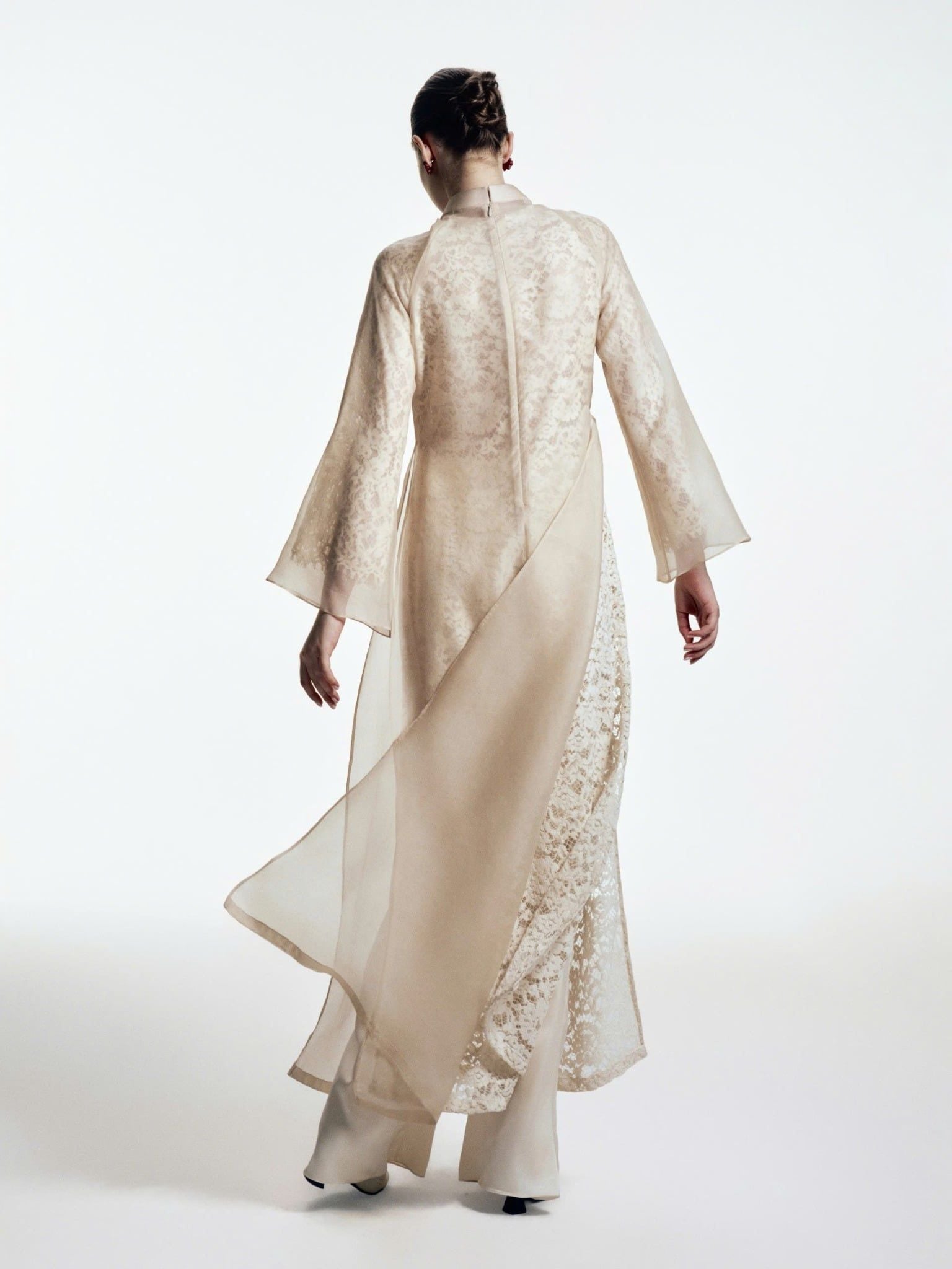 Thiết kế 2 lớp độc đáo, lớp ren bên trong tạo độ mềm nữ tính, tơ tằm bên ngoài nâng tầm sang trọng và bay bổng cho tổng thể trang phục.