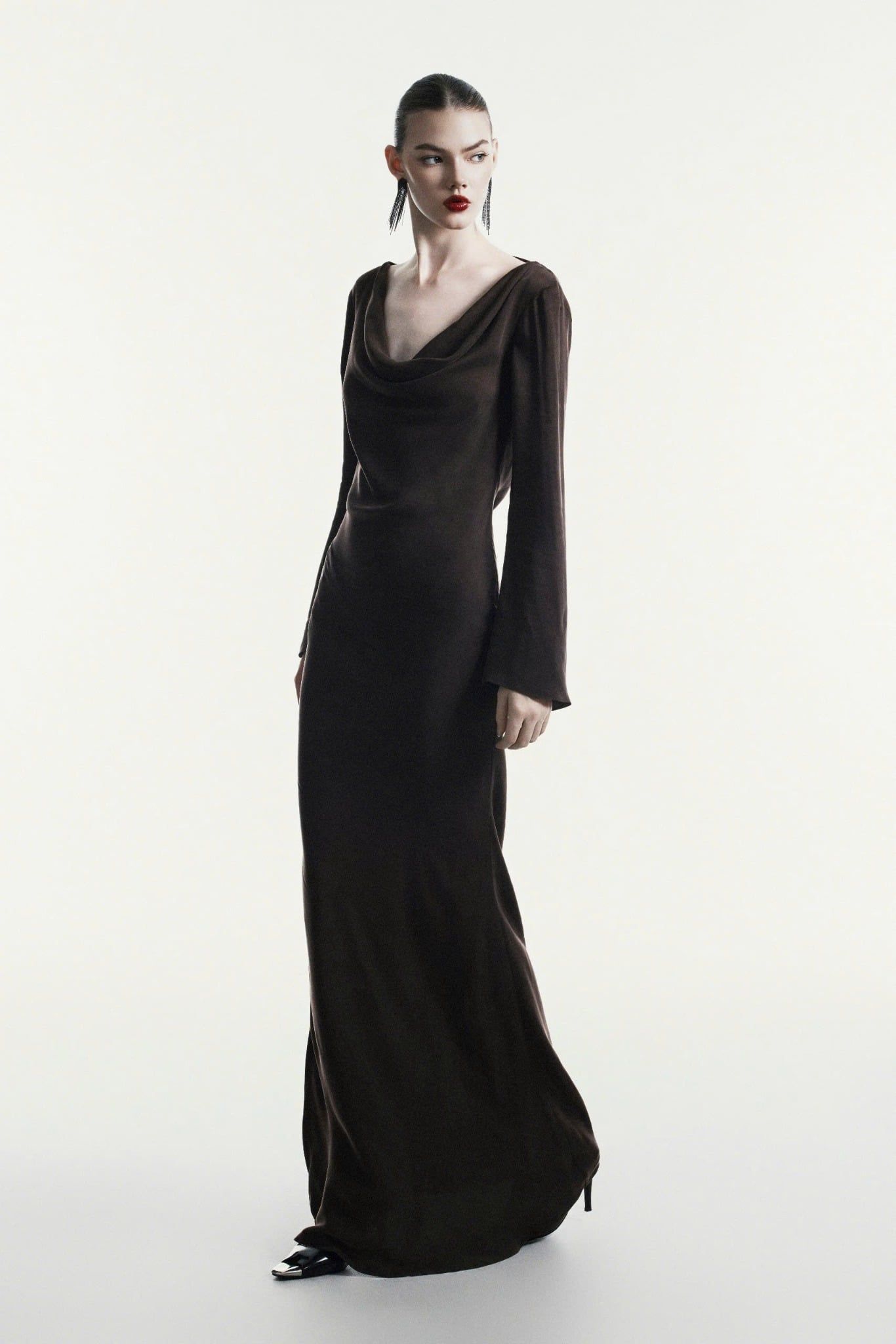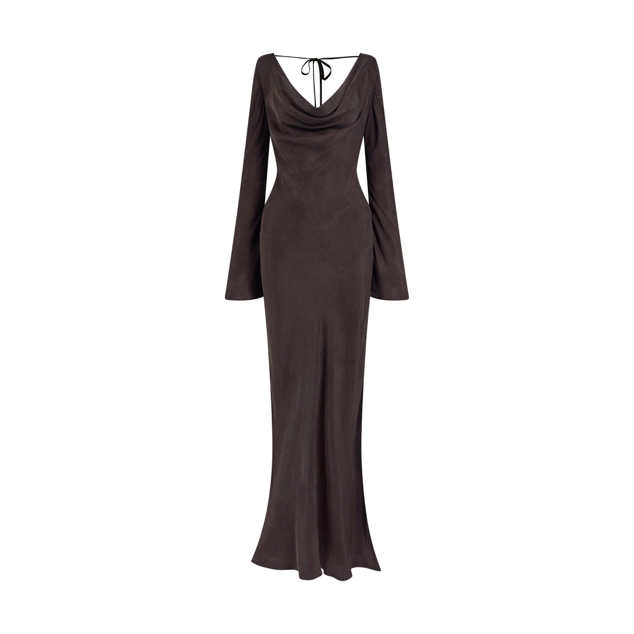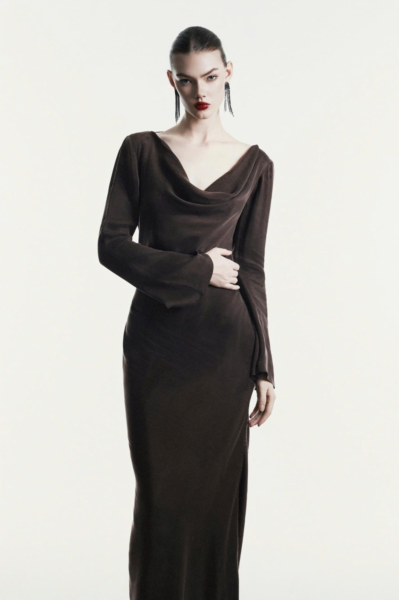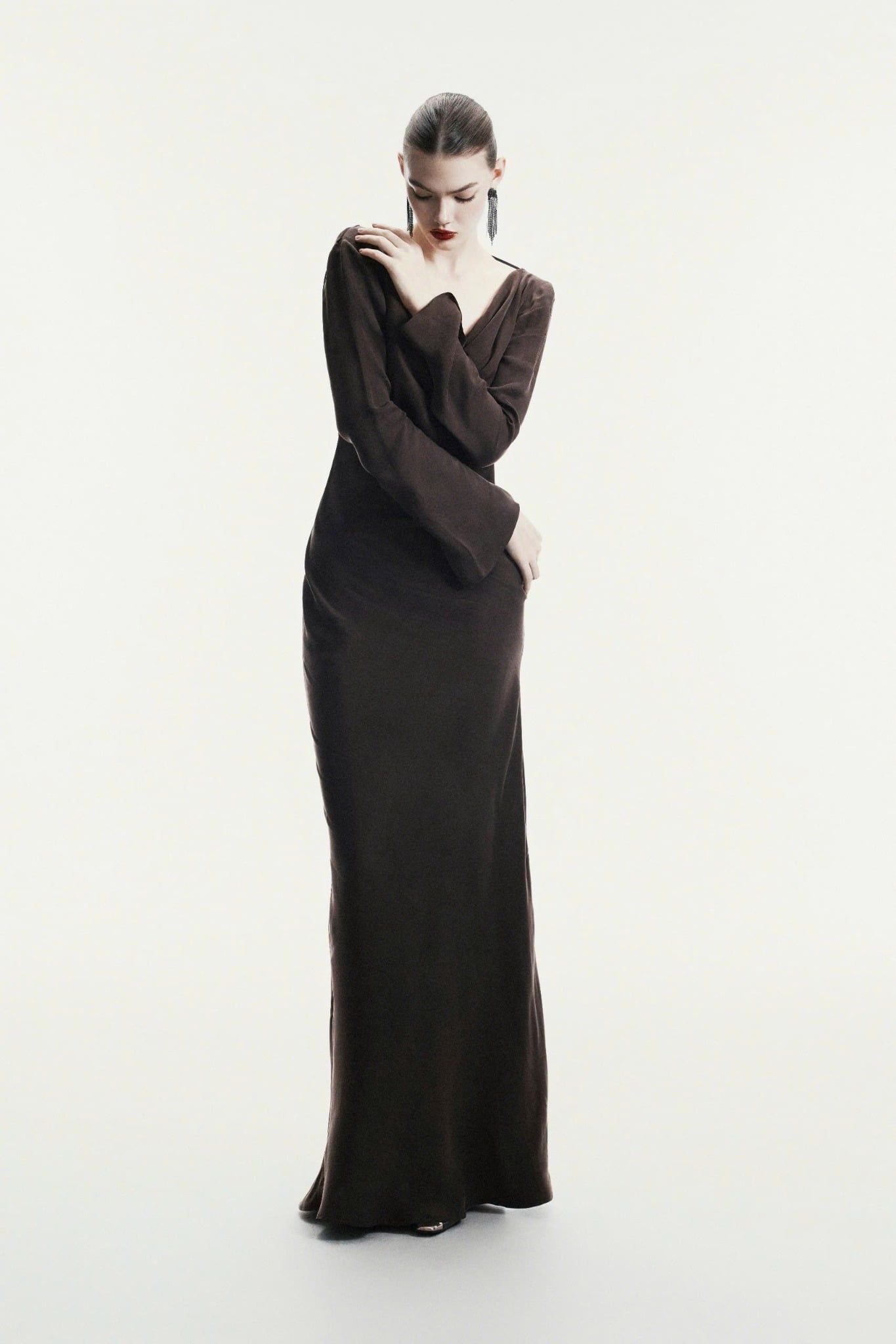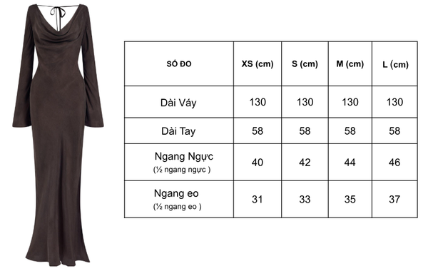 Noir Drape Evening Gown là chiếc đầm dạ hội đầy cuốn hút với phom dáng dài trang trọng và thiết kế rũ mềm mại, tạo hiệu ứng uyển chuyển mỗi khi di chuyển. Lấy cảm hứng từ phong cách tối giản nhưng đầy chiều sâu, chiếc đầm mang gam màu nâu cổ điển – biểu tượng của sự thanh lịch và bí ẩn. Phần thân váy được điều chỉnh để ôm nhẹ cơ thể ở những vị trí tinh tế, đồng thời giữ được nét thanh thoát của một thiết kế dạ hội đẳng cấp, giúp người mặc tỏa sáng.