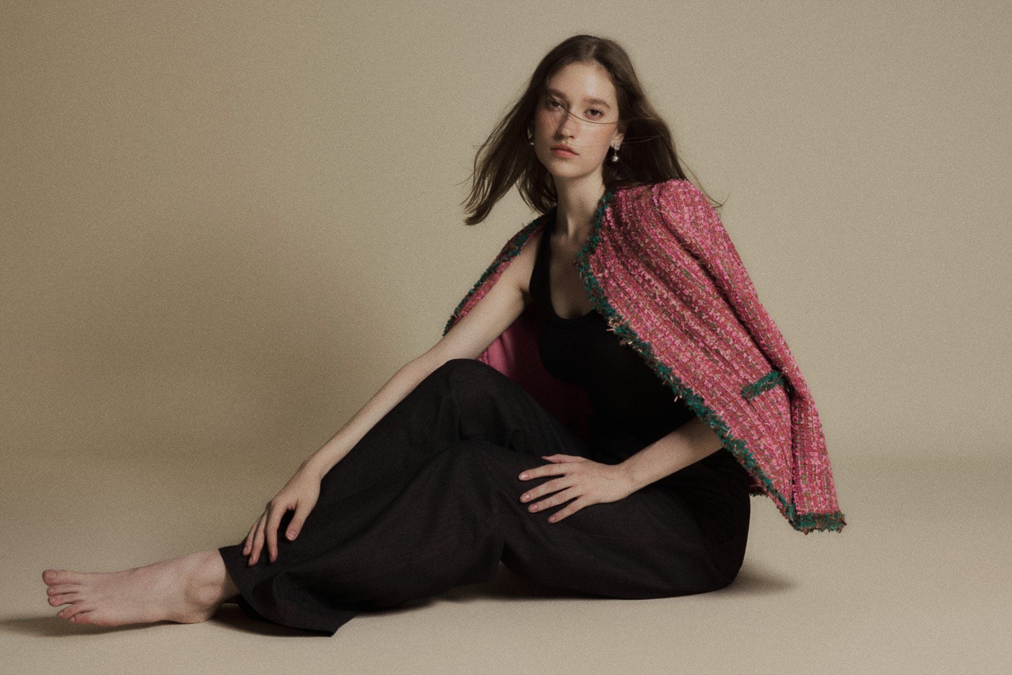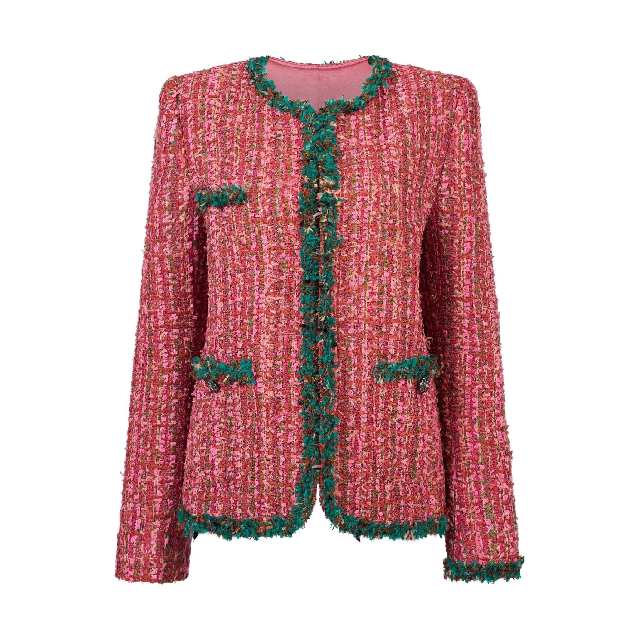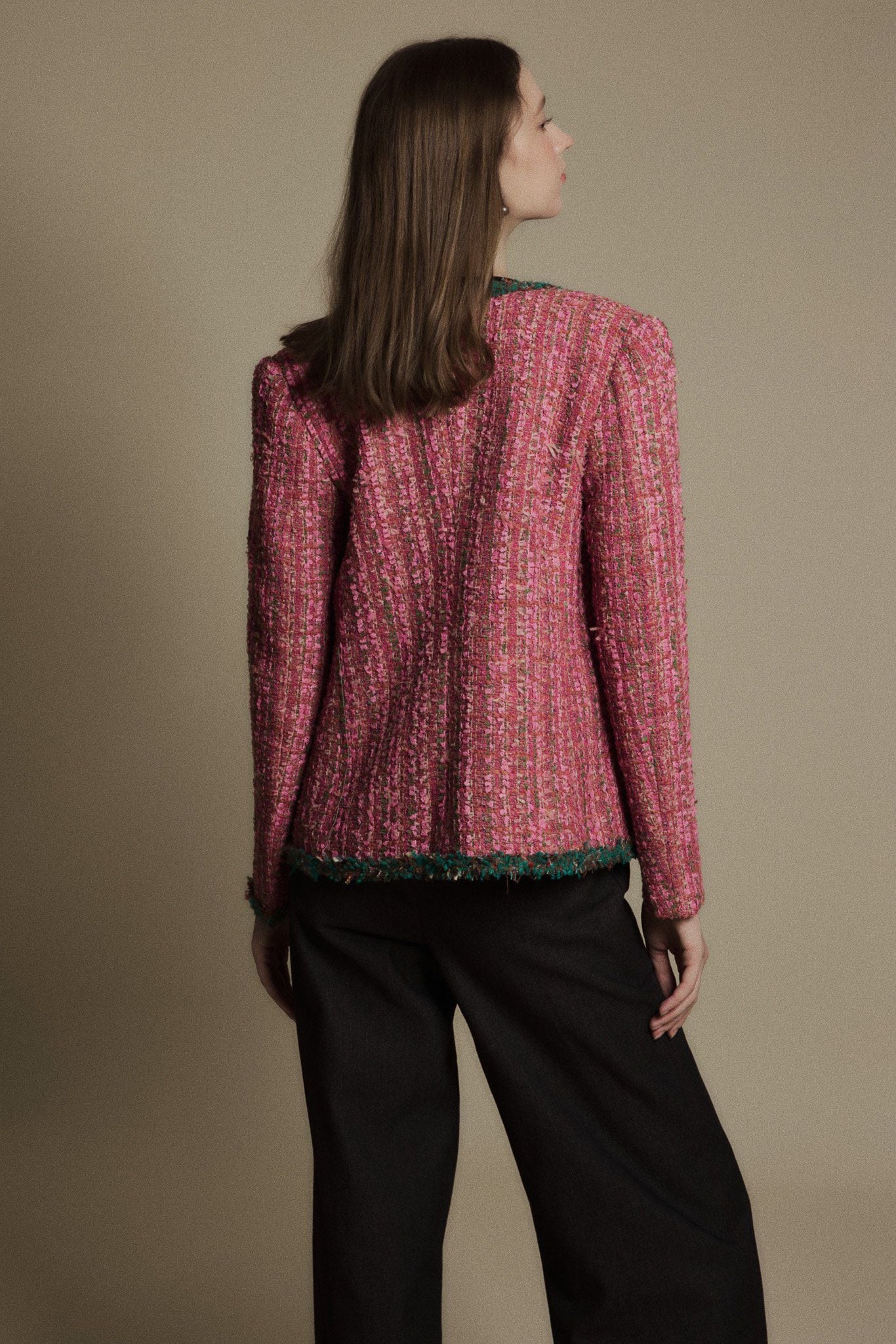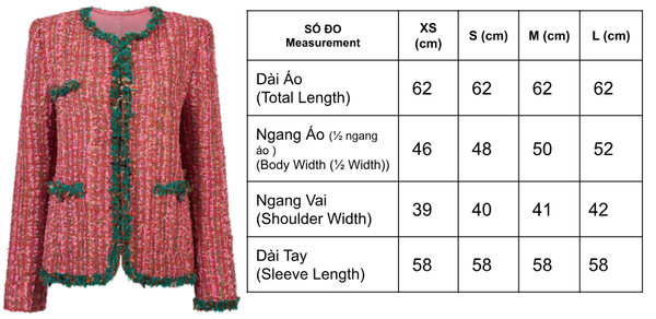 ROSE QUARTZ TWEED BLAZER là chiếc blazer tweed mang sắc hồng Rose Quartz rực rỡ, được điểm xuyết bằng chi tiết viền xanh lá, tạo nên sự tương phản tinh tế và sống động. Thiết kế dáng cổ tròn không ve, phom gọn gàng giúp blazer vừa giữ nét cổ điển, vừa phảng phất tinh thần hiện đại, trẻ trung. Đây là mẫu thiết kế dành cho người phụ nữ yêu thích sự sáng tạo, táo bạo nhưng vẫn thanh lịch.