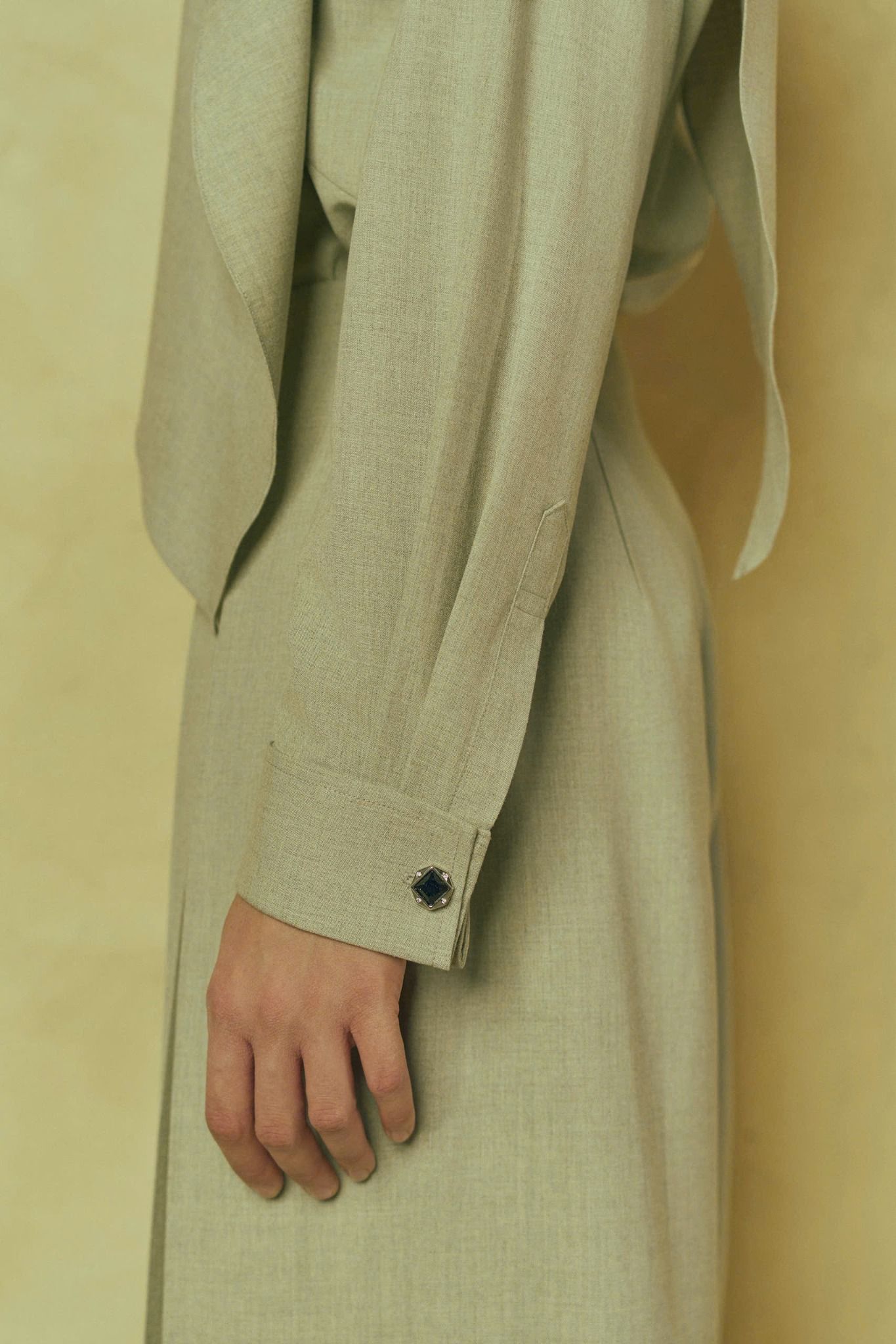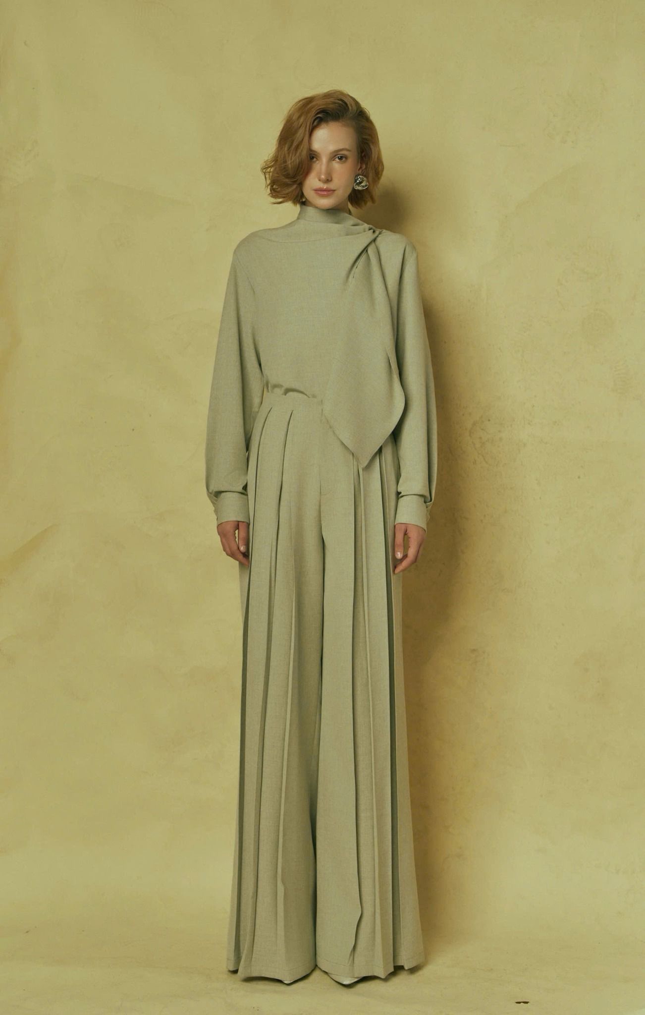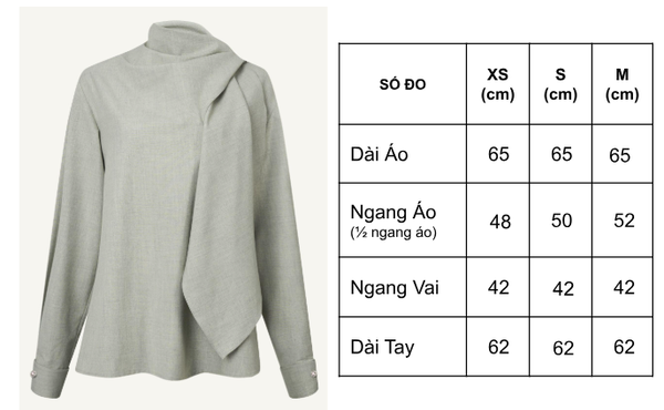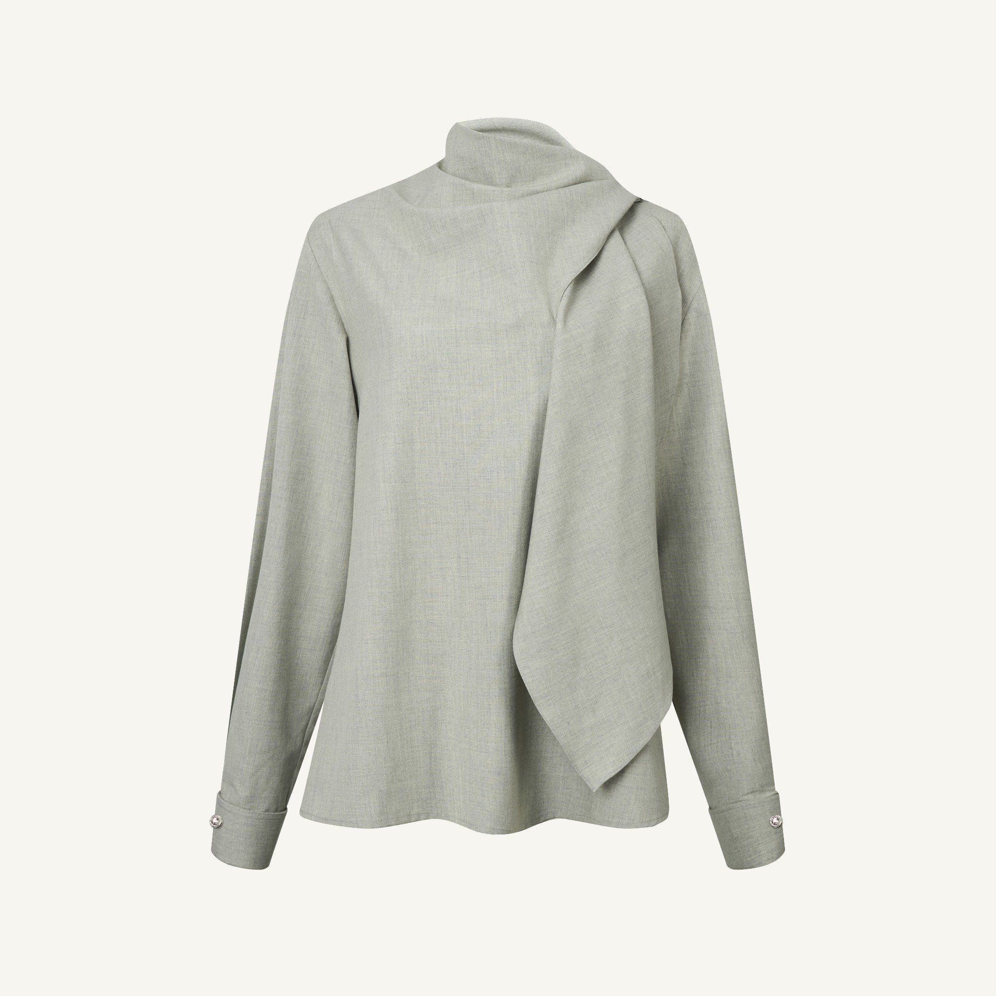 𝗦𝗘𝗥𝗘𝗡𝗘 𝗛𝗜𝗚𝗛 𝗡𝗘𝗖𝗞 𝗗𝗥𝗔𝗣𝗘𝗗 𝗕𝗟𝗢𝗨𝗦𝗘 là thiết kế blouse cổ cao mang tinh thần “serene” – tĩnh tại, sâu lắng và đầy tinh tế. Chi tiết cổ drape (xếp nếp nhẹ nhàng) mềm rũ tạo nên sự chuyển động nhẹ nhàng, uyển chuyển khi mặc. Dáng áo suông thanh thoát giúp tôn lên vẻ đẹp tự nhiên và thoải mái cho người mặc mà không cần quá nhiều chi tiết. Thiết kế tay dài, form ôm nhẹ vào phần vai, đặc biệt phù hợp để mặc đơn lẻ hoặc layer trong những set đồ thanh lịch.