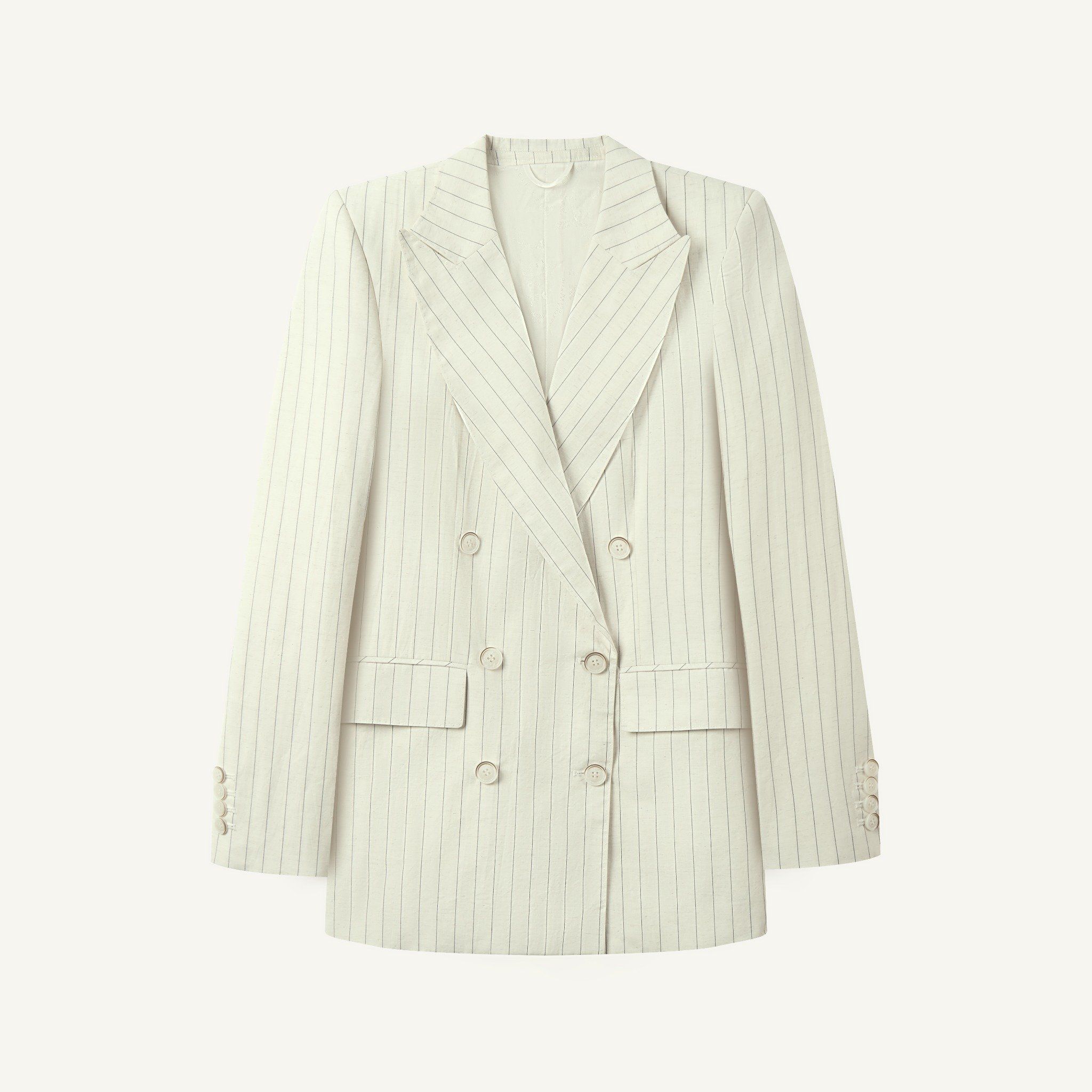 𝗦𝗨𝗡𝗕𝗘𝗔𝗠 𝗖𝗥𝗘𝗔𝗠 𝗣𝗜𝗡𝗦𝗧𝗥𝗜𝗣𝗘 𝗗𝗢𝗨𝗕𝗟𝗘𝗦 𝗕𝗥𝗘𝗔𝗦𝗧 𝗦𝗨𝗜𝗧 là bản hòa ca giữa sự cổ điển và khí chất hiện đại. Bộ suit kẻ sọc màu kem được cắt may từ chất liệu cotton pha linen, mang đến cảm giác nhẹ tênh và dễ thở cho những ngày nắng. Phom dáng được thiết kế relax vừa phải, với blazer 2 khuy phối cùng quần suông rộng và áo gilet đồng bộ, tạo nên tổng thể ba lớp trang nhã, chỉn chu nhưng không gò bó. Những đường kẻ sọc mảnh chạy dọc giúp kéo dài vóc dáng và tăng thêm nét thanh lịch cho người mặc. Bộ suit gợi đến hình ảnh một người phụ nữ tự do, bước đi giữa nắng sớm trong khu vườn Địa Trung Hải – bình thản, thong dong nhưng đầy bản lĩnh.