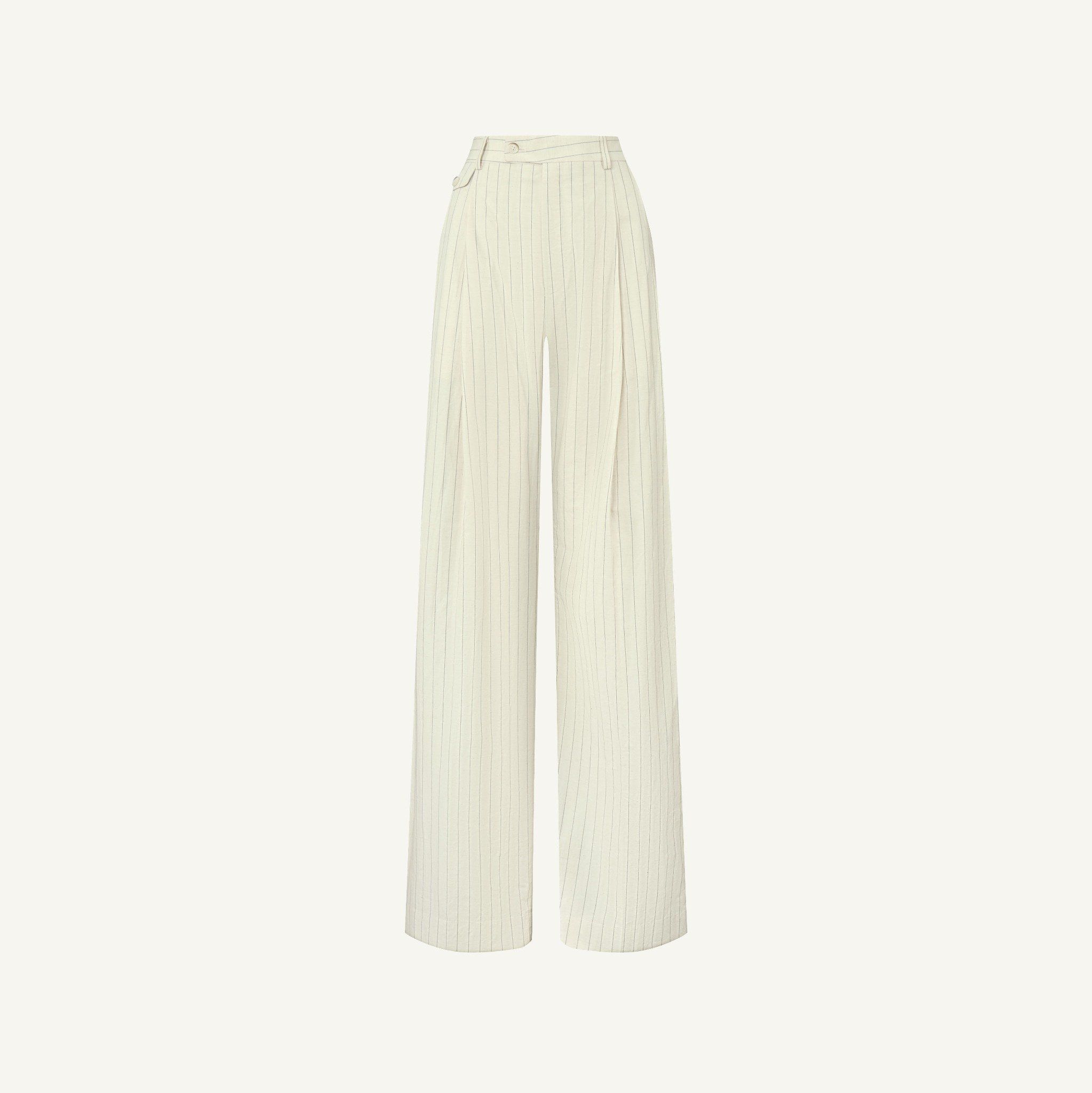 𝗦𝗨𝗡𝗕𝗘𝗔𝗠 𝗖𝗥𝗘𝗔𝗠 𝗣𝗜𝗡𝗦𝗧𝗥𝗜𝗣𝗘 𝗗𝗢𝗨𝗕𝗟𝗘𝗦 𝗕𝗥𝗘𝗔𝗦𝗧 𝗦𝗨𝗜𝗧 là bản hòa ca giữa sự cổ điển và khí chất hiện đại. Bộ suit kẻ sọc màu kem được cắt may từ chất liệu cotton pha linen, mang đến cảm giác nhẹ tênh và dễ thở cho những ngày nắng. Phom dáng được thiết kế relax vừa phải, với blazer 2 khuy phối cùng quần suông rộng và áo gilet đồng bộ, tạo nên tổng thể ba lớp trang nhã, chỉn chu nhưng không gò bó. Những đường kẻ sọc mảnh chạy dọc giúp kéo dài vóc dáng và tăng thêm nét thanh lịch cho người mặc. Bộ suit gợi đến hình ảnh một người phụ nữ tự do, bước đi giữa nắng sớm trong khu vườn Địa Trung Hải – bình thản, thong dong nhưng đầy bản lĩnh.