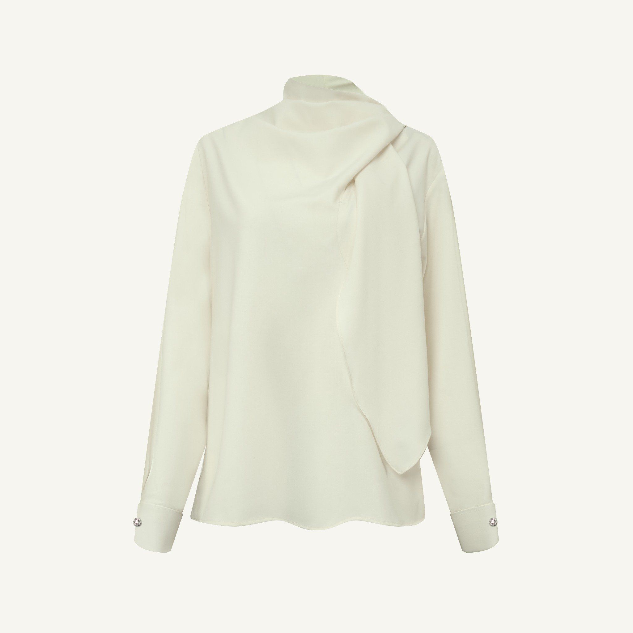 𝗧𝗪𝗜𝗟𝗜𝗚𝗛𝗧 𝗛𝗜𝗚𝗛 𝗡𝗘𝗖𝗞 𝗗𝗥𝗔𝗣𝗘𝗗 𝗕𝗟𝗢𝗨𝗦𝗘 là thiết kế blouse cổ cao mang tinh thần tĩnh tại, sâu lắng và đầy tinh tế. Chi tiết cổ drape (xếp nếp nhẹ nhàng) mềm rũ tạo nên sự chuyển động nhẹ nhàng, uyển chuyển khi mặc. Dáng áo suông thanh thoát giúp tôn lên vẻ đẹp tự nhiên và thoải mái cho người mặc mà không cần quá nhiều chi tiết.