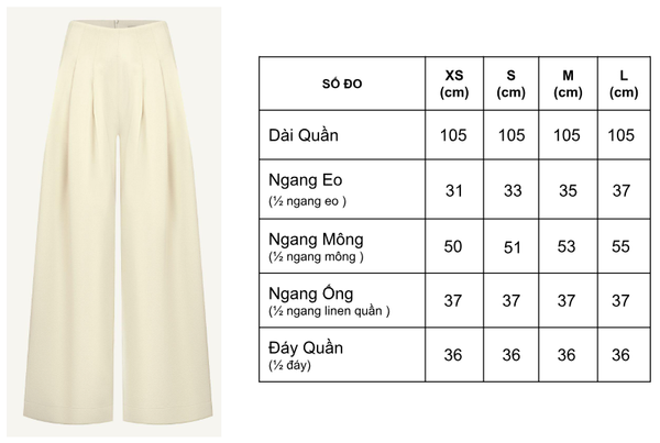 Lưu ý bảo quản: Treo quần bằng móc có kẹp hoặc thanh ngang, tránh gập làm gãy ly. Đặt nơi khô thoáng, tránh tiếp xúc trực tiếp với ánh nắng và độ ẩm cao.